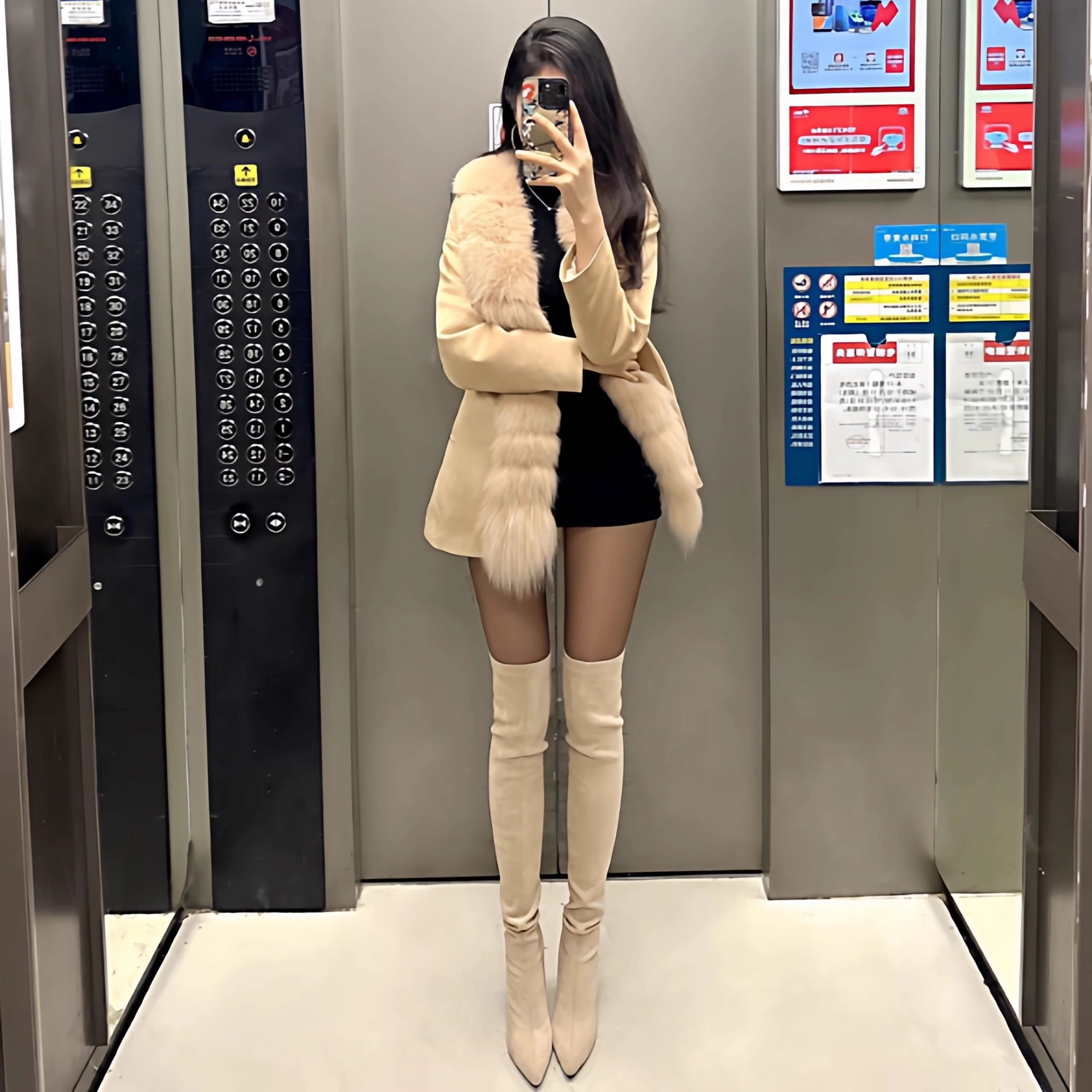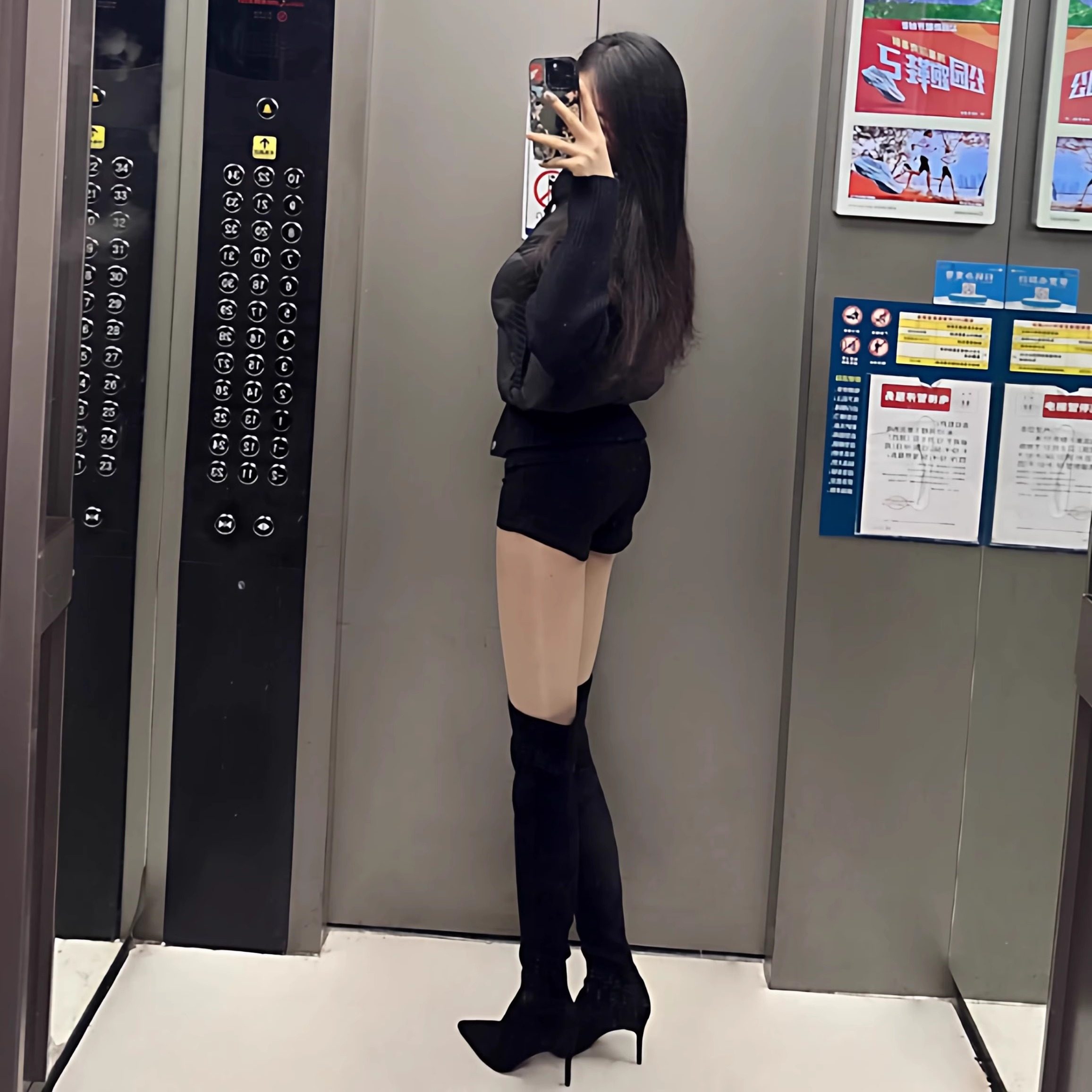 优尚品~超显腿长过膝高筒弹力瘦瘦靴绒面粗跟长筒靴高跟尖头长靴