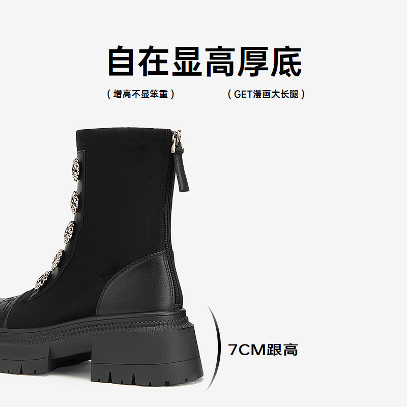 天美意粗跟厚底增高加绒英伦马丁靴女鞋子休闲短靴皮靴2025冬新款