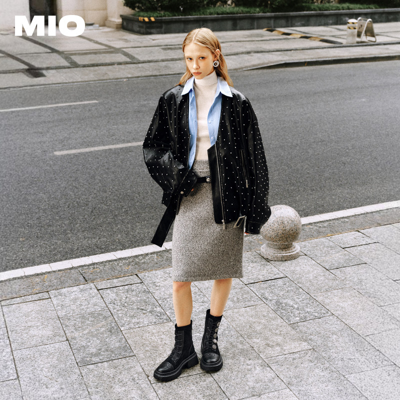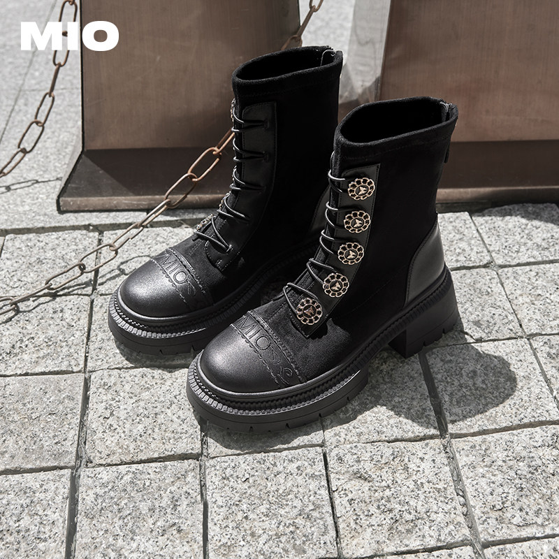 MIO米奥冬季短靴圆头高跟中筒瘦瘦靴复古精致扣带酷感马丁靴女