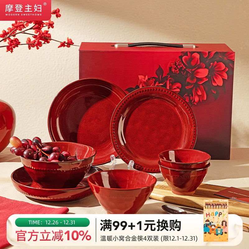 摩登主妇红色新婚结婚订婚礼物送新人闺蜜高级实用碗碟盘餐具套装