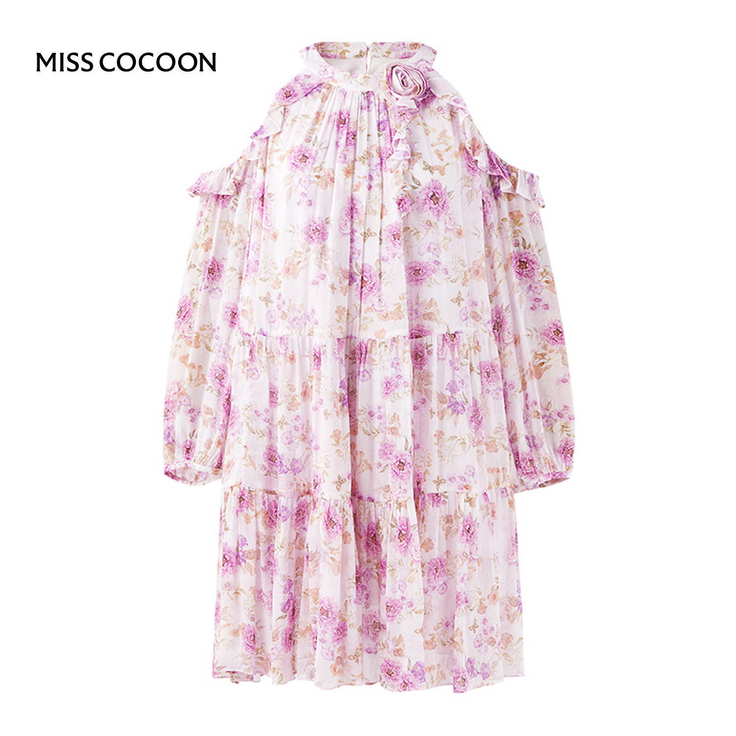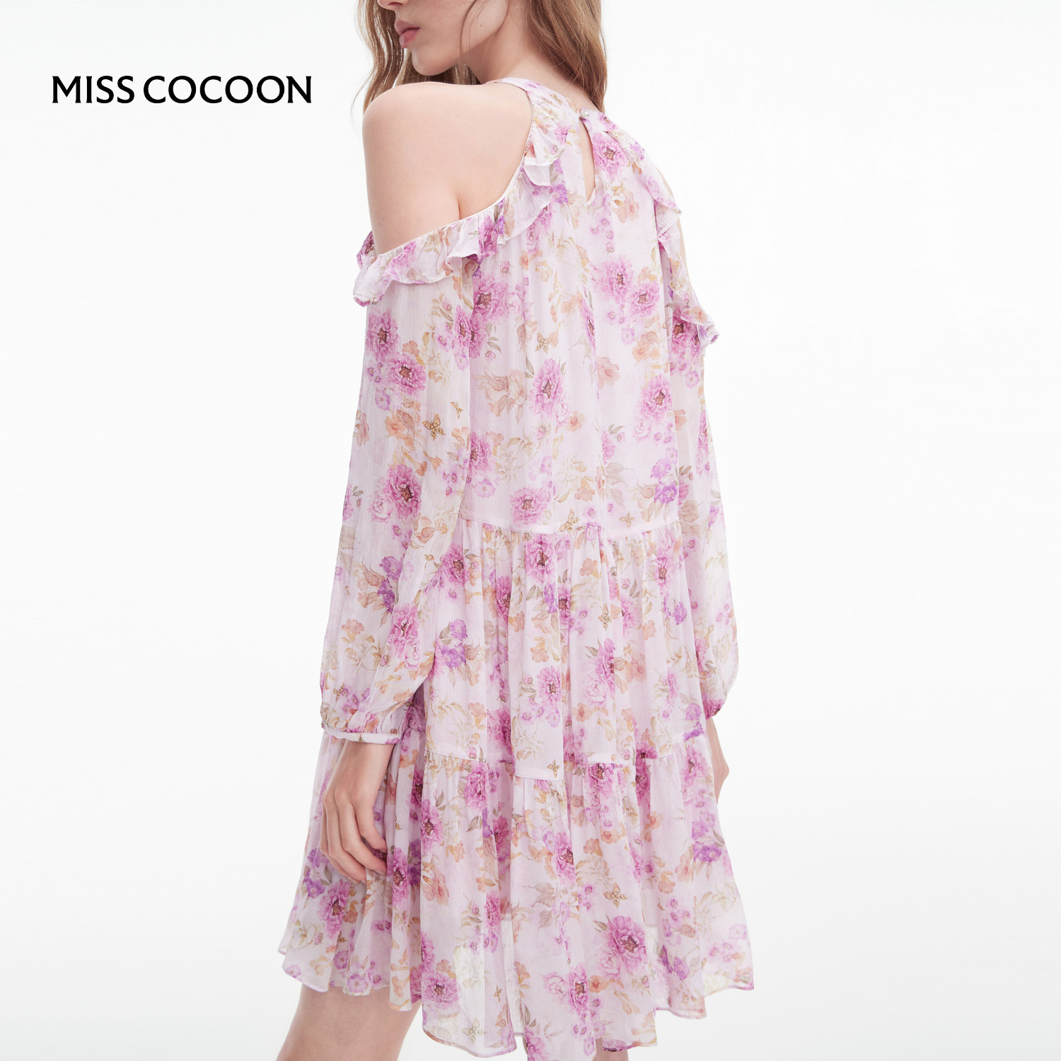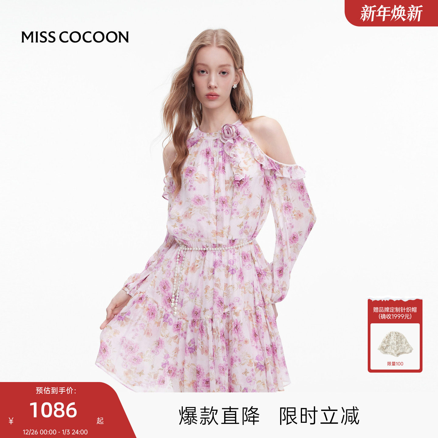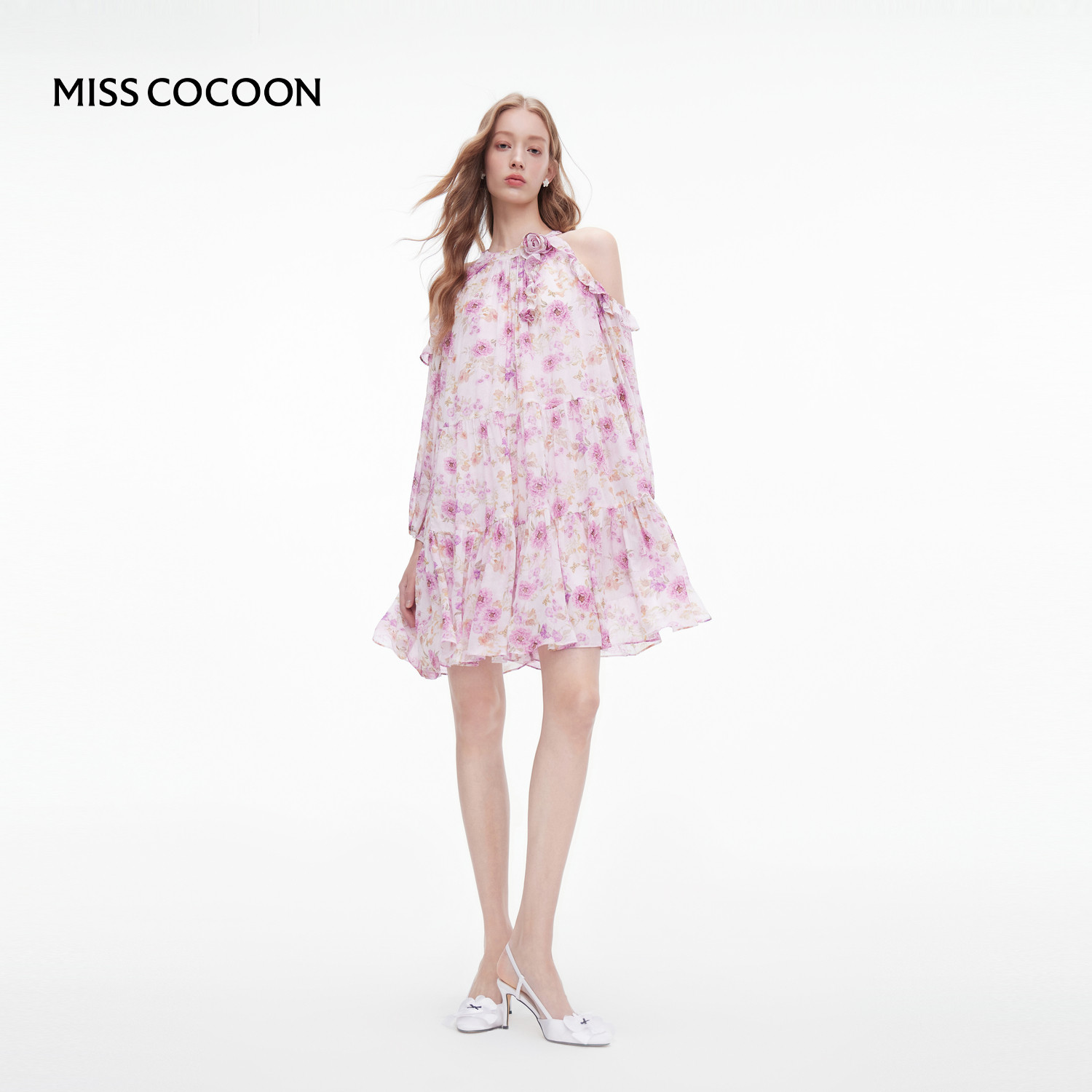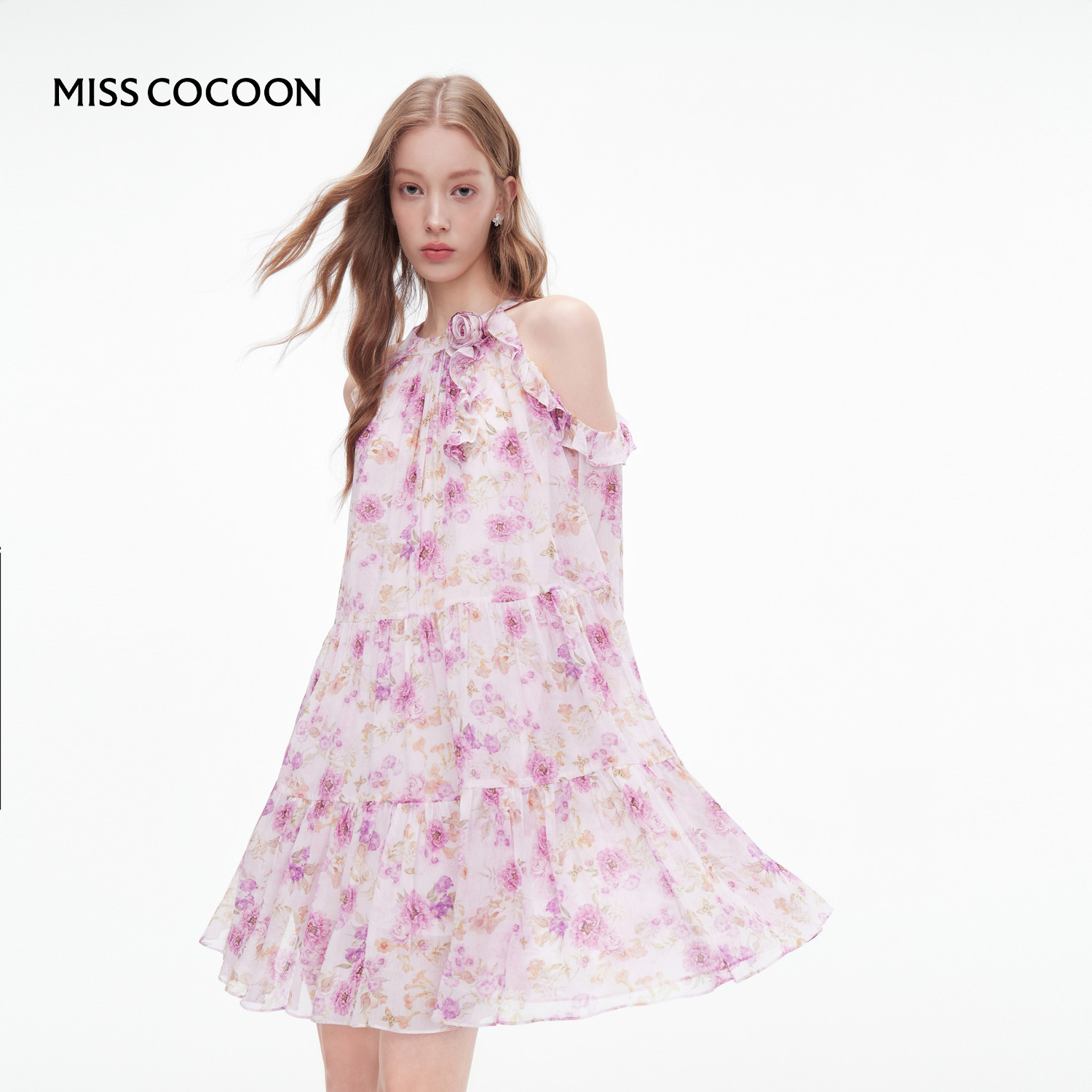 MISSCOCOON可可尼挂脖长袖裙子女2025秋季新款法式度假印花连衣裙