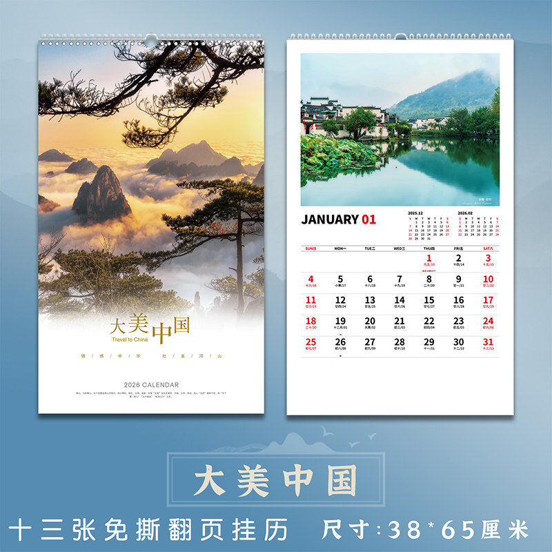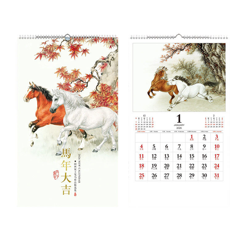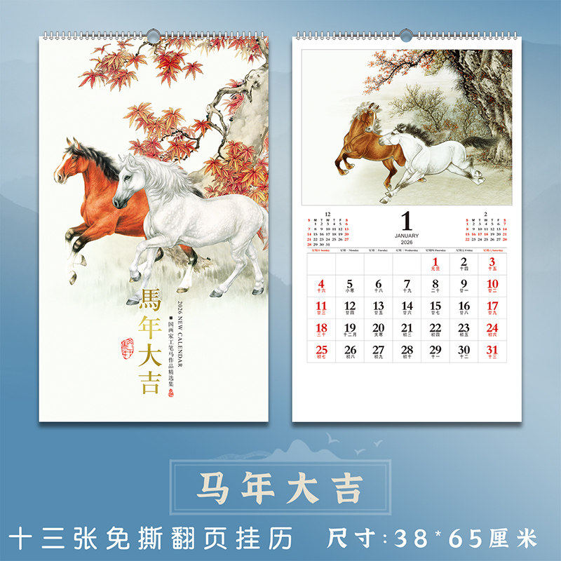 2026挂历新款马年定制家用挂墙山水挂历油墨画风景免撕十三张新款创意月历大号日历公司骏马奔腾挂墙日历