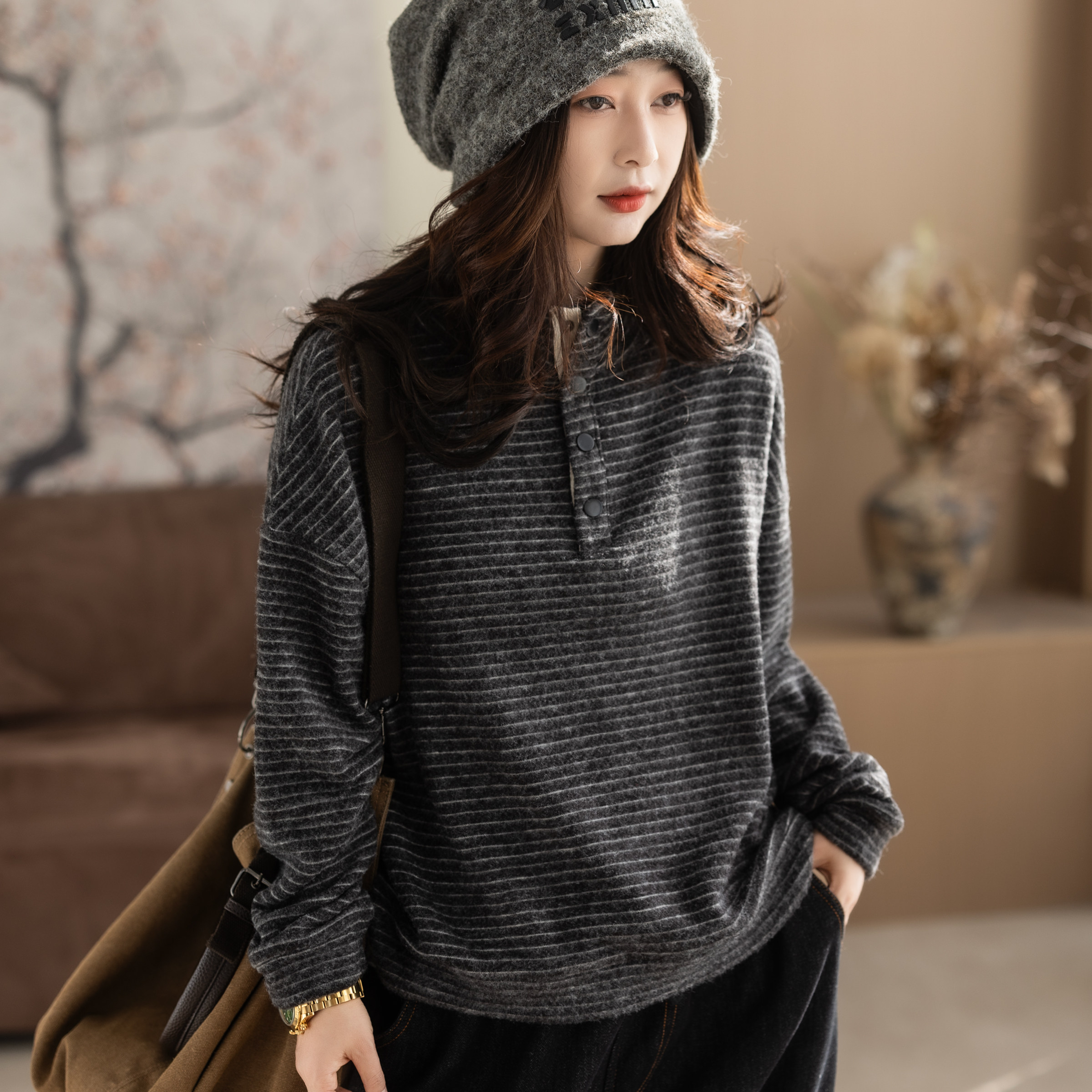 咖咪羽大码立领条纹加厚长袖T恤设计感宽松显瘦休闲外套卫衣女