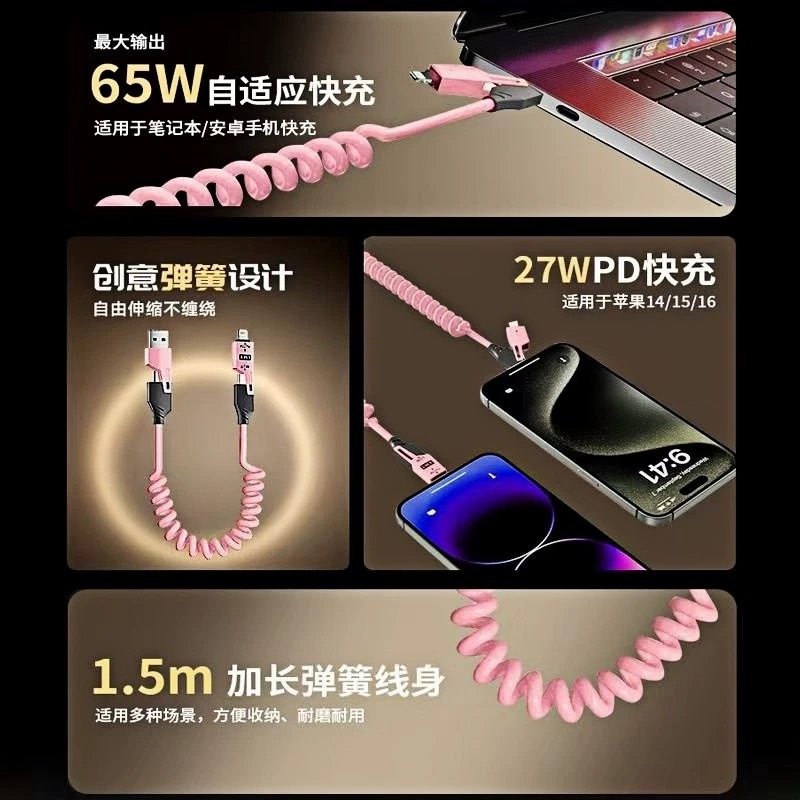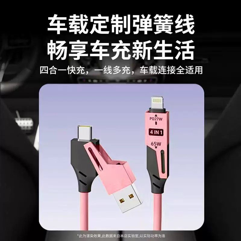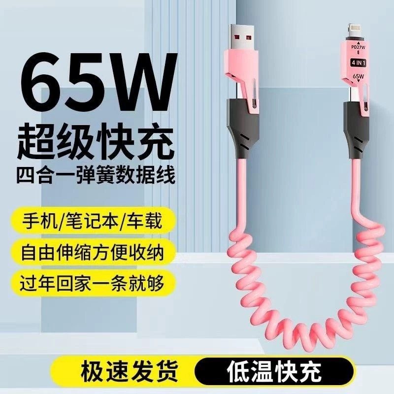 车载超级快充65W弹簧数据线四合一伸缩适用苹果华为小米安卓手机