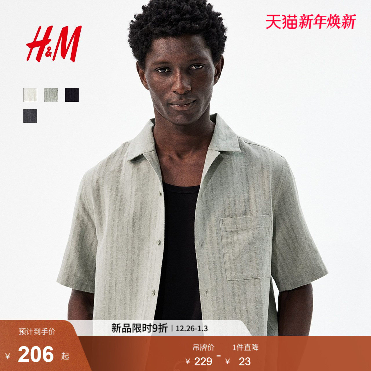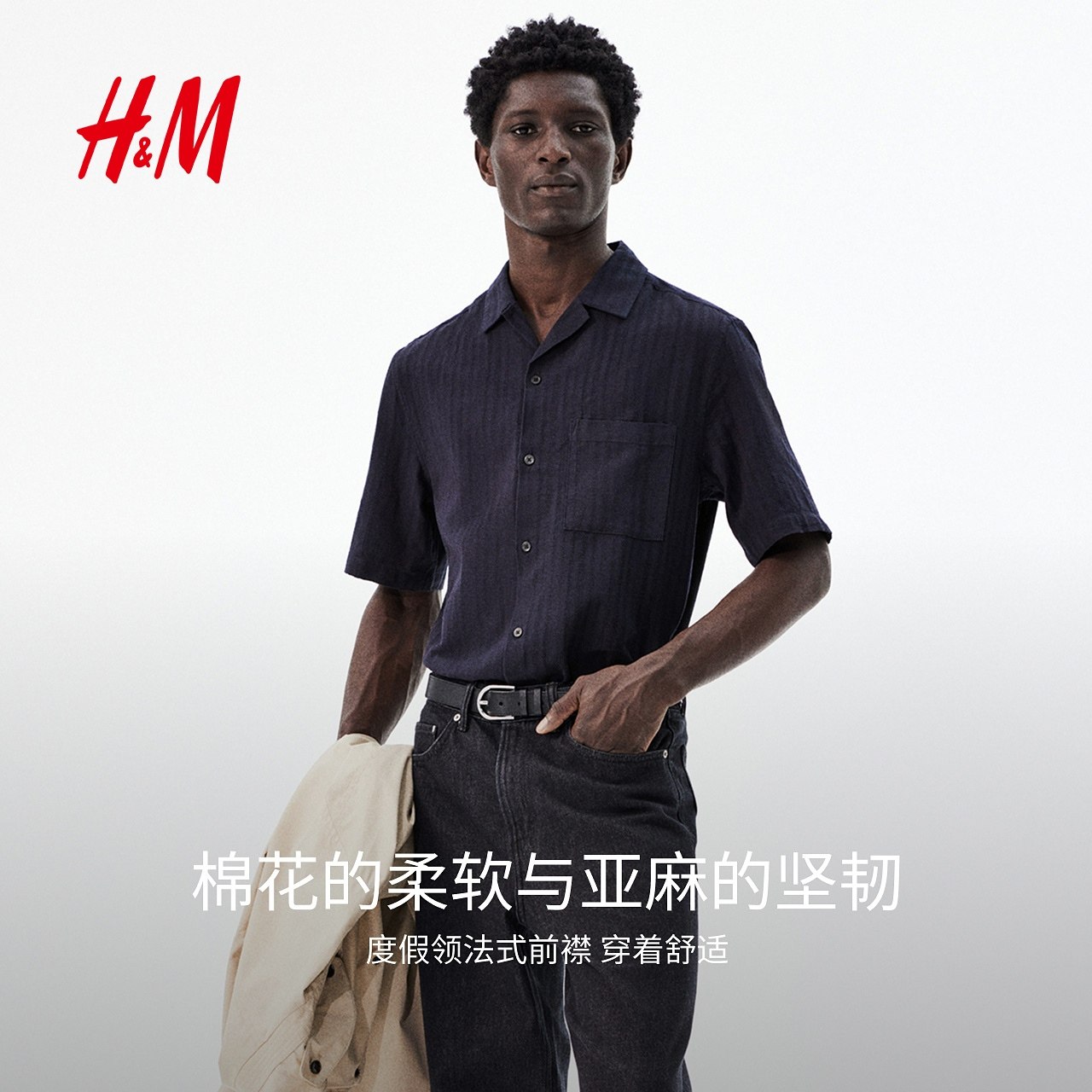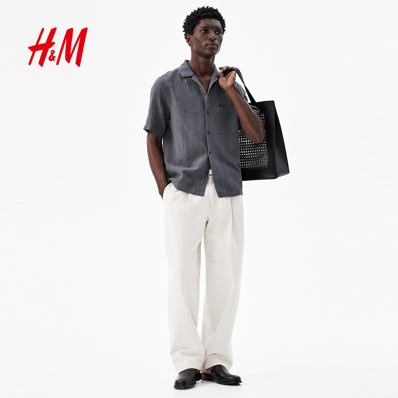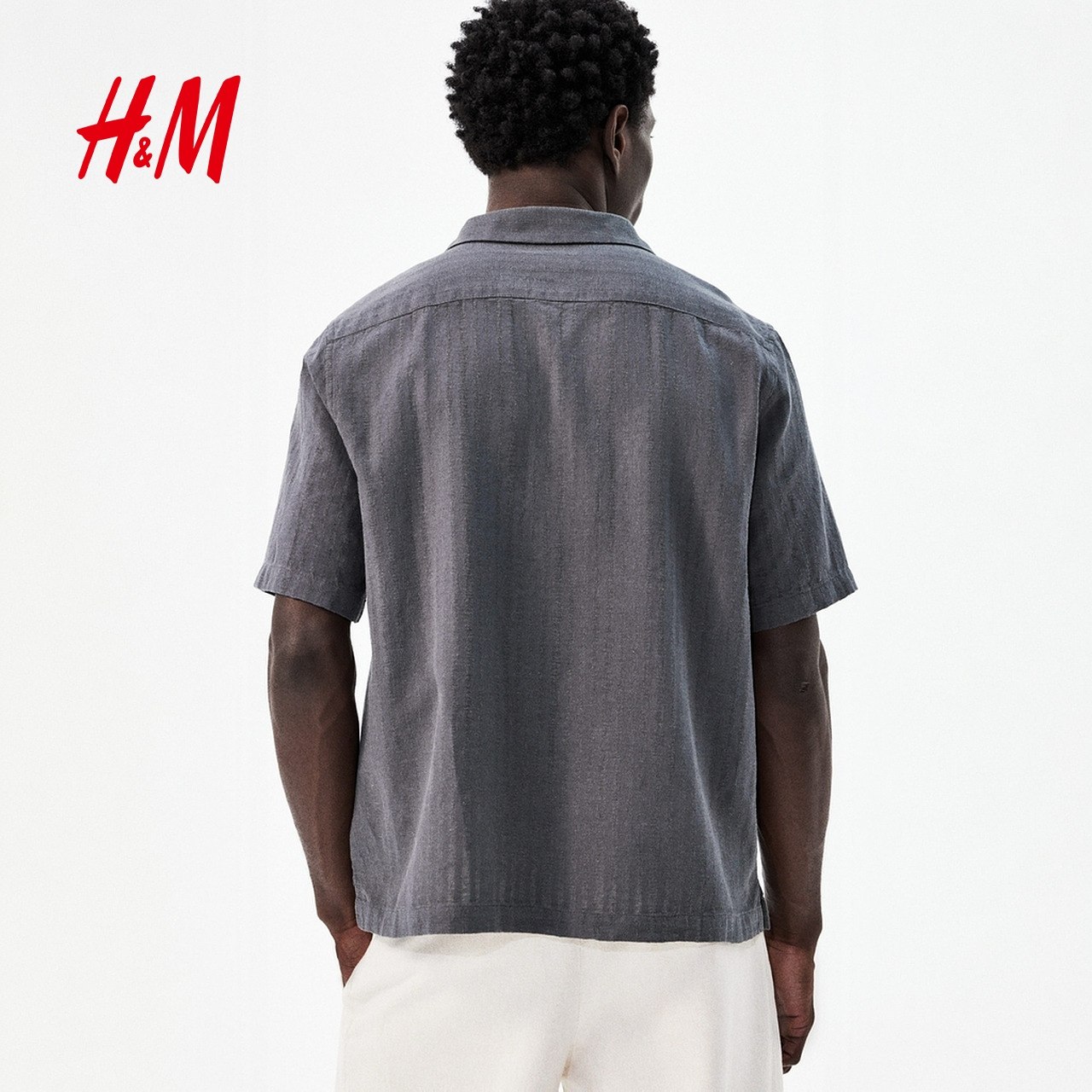 HM男装古巴领衬衫春季亚麻混纺法式度假领通勤衬衣1265556