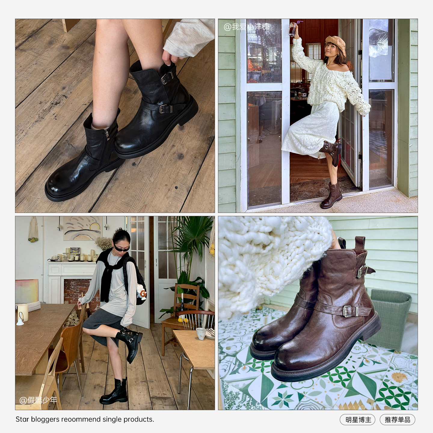 全牛皮~mona真皮马丁靴女秋冬中筒烟筒靴厚底内增高切尔西短靴子