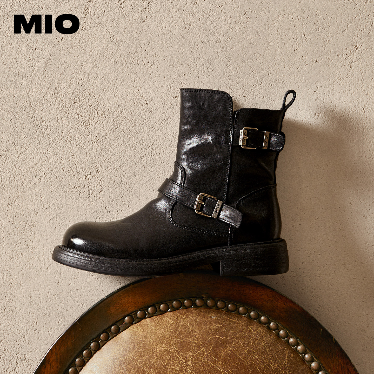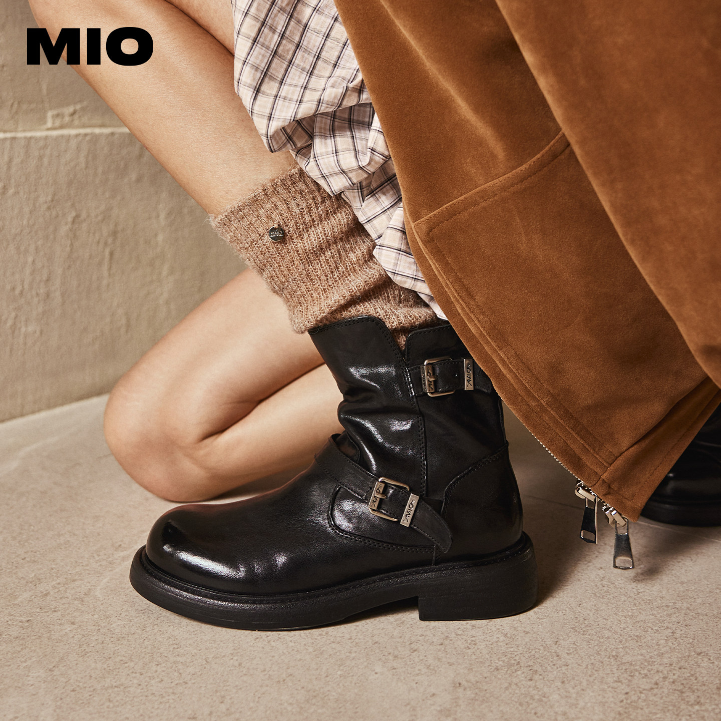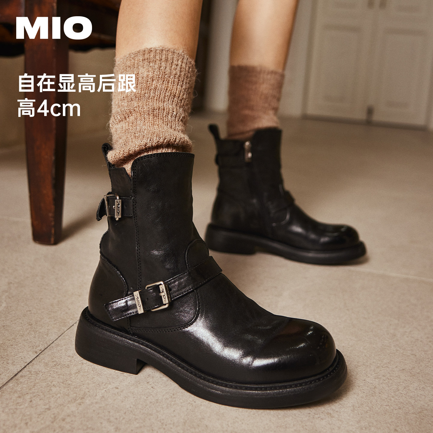 MIO米奥加绒褶皱马丁靴金属粗跟靴子冬新款女鞋牛皮革切尔西短靴