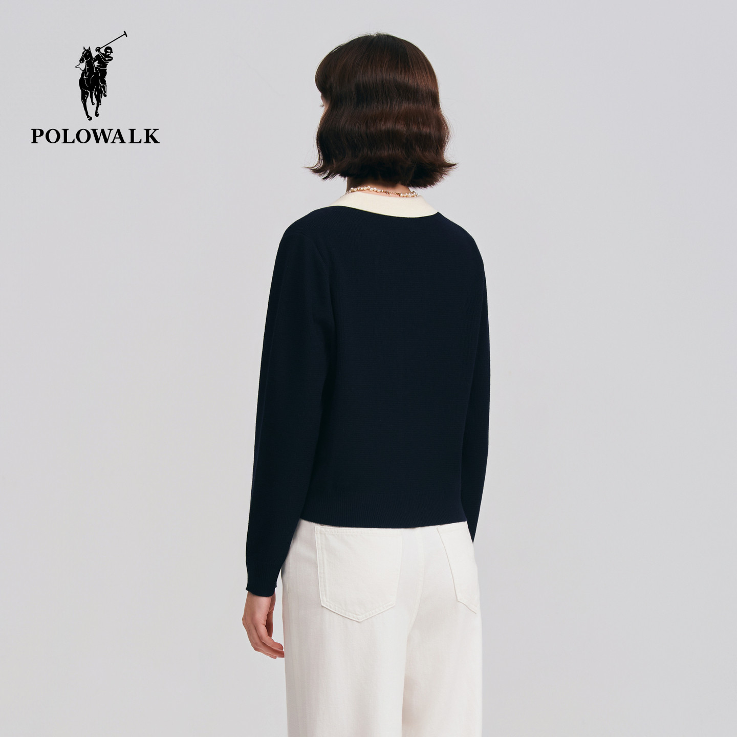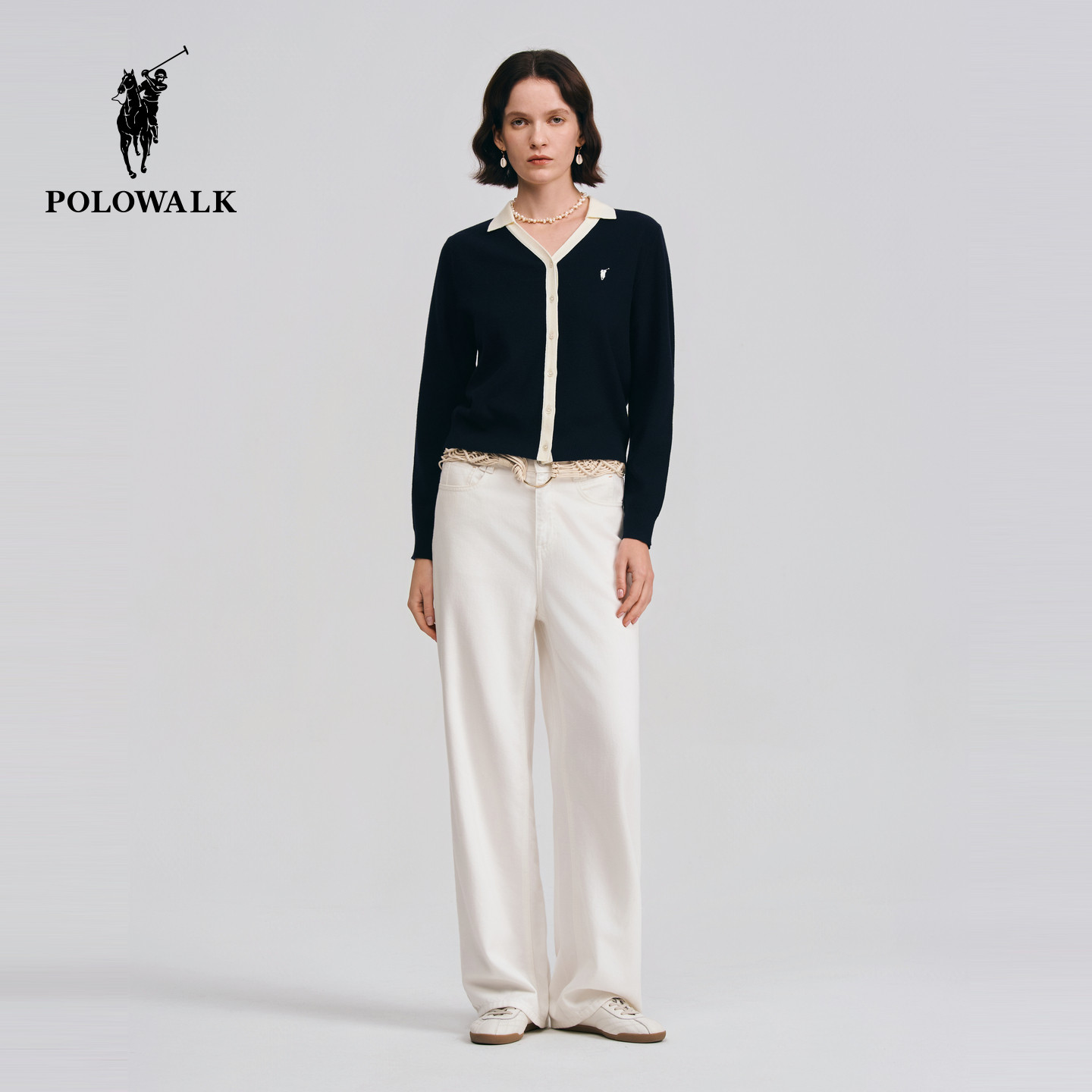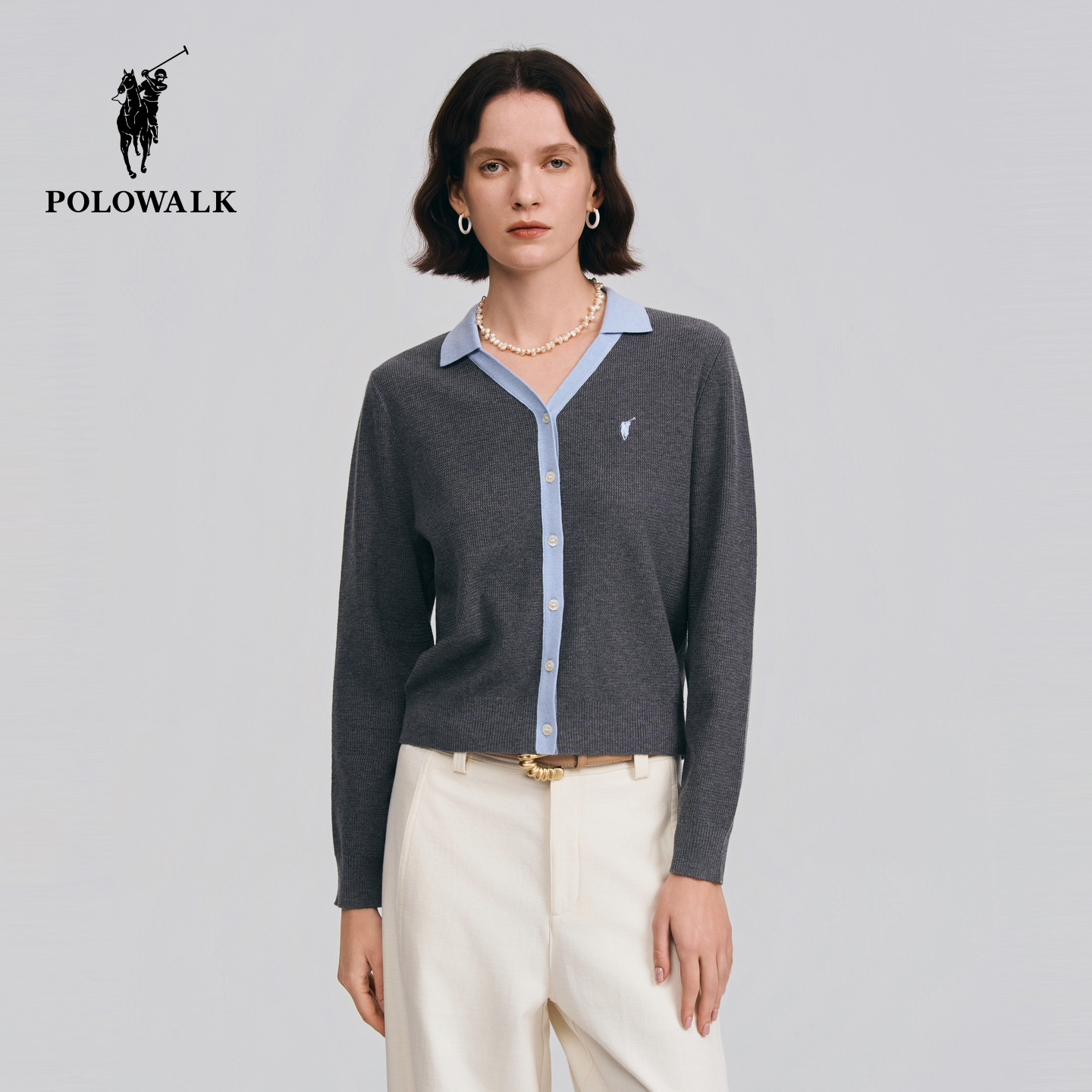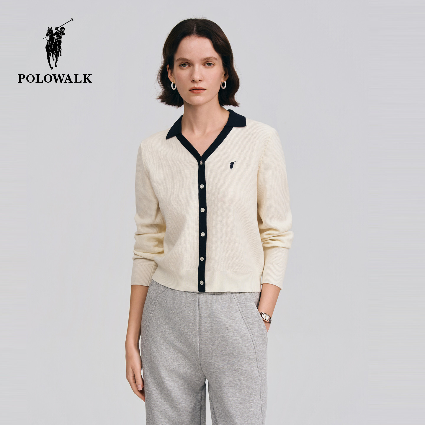 POLOWALK女式长袖针织衫2026春季新品优雅撞色小V领显瘦针织开衫