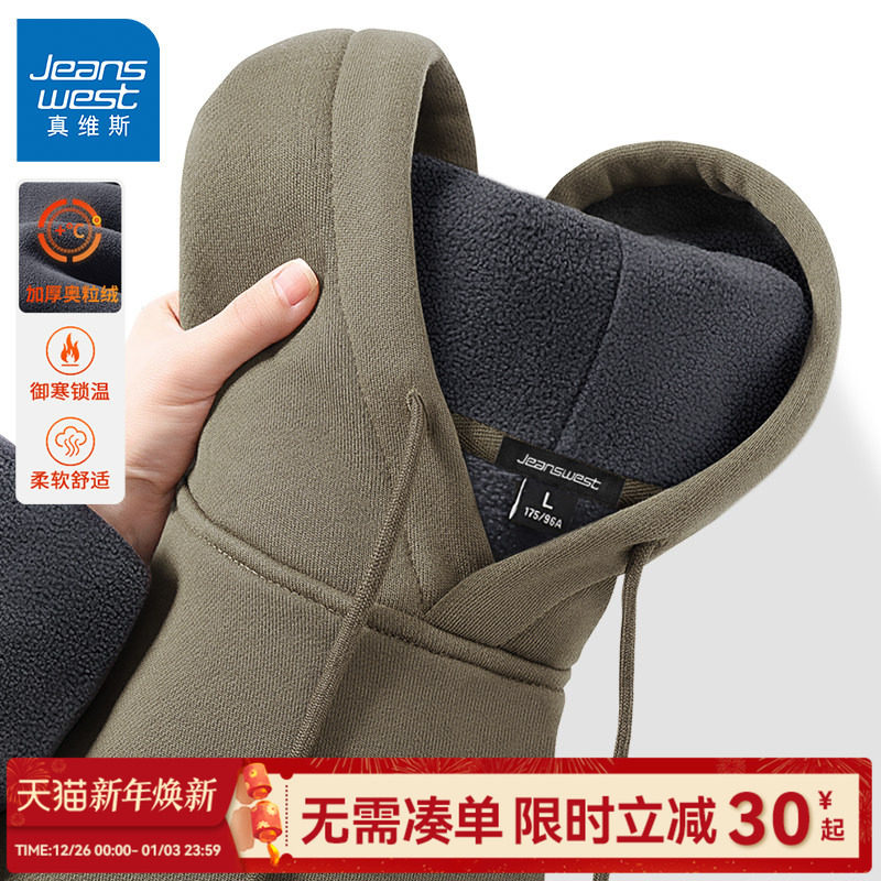 GV真维斯加绒卫衣男连帽冬季加厚男士外套2025新款潮牌冬装上衣C