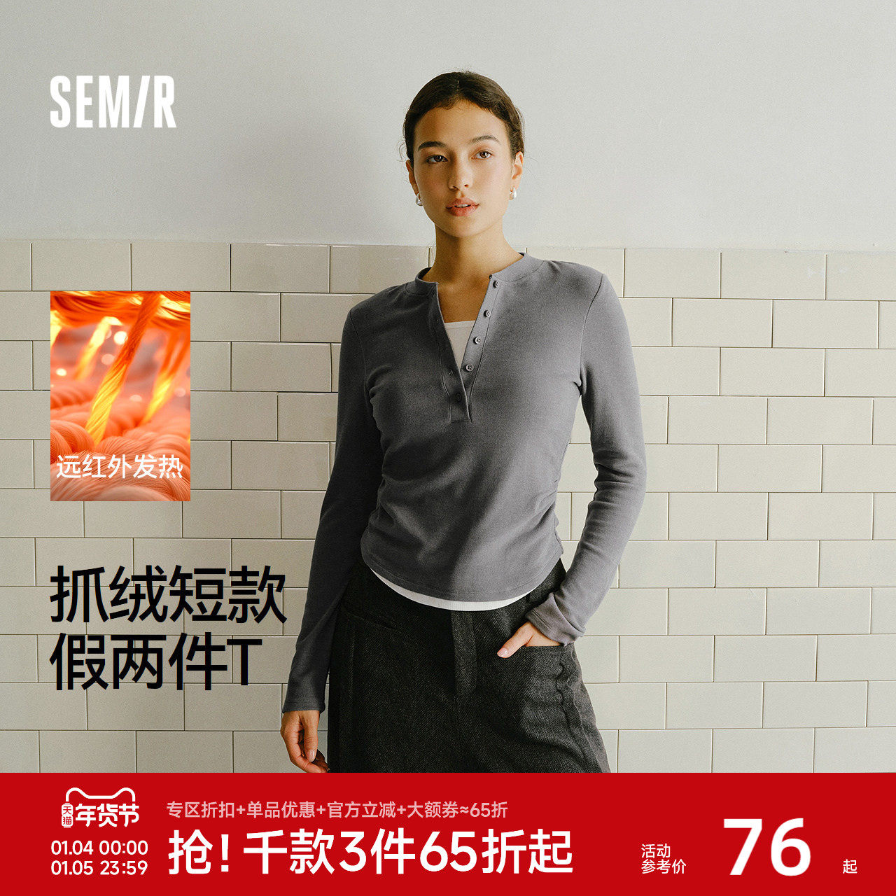 森马长袖T恤女短款发热抓绒假两件2025冬新款亨利领紧身衣服显瘦