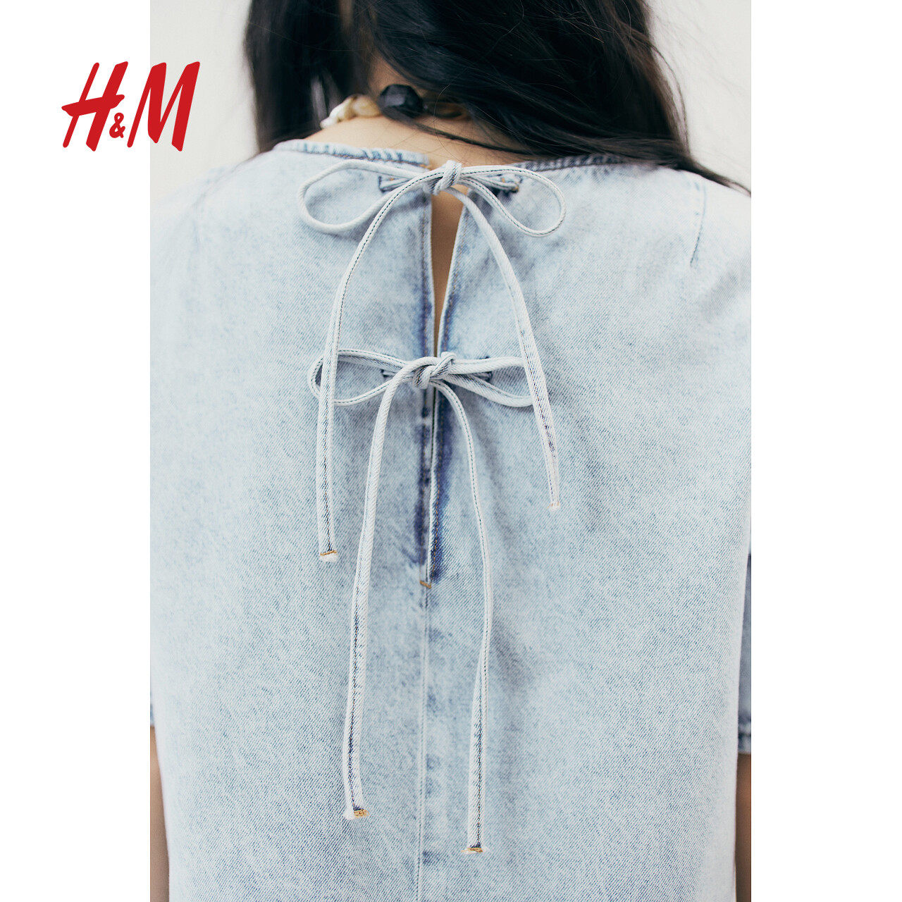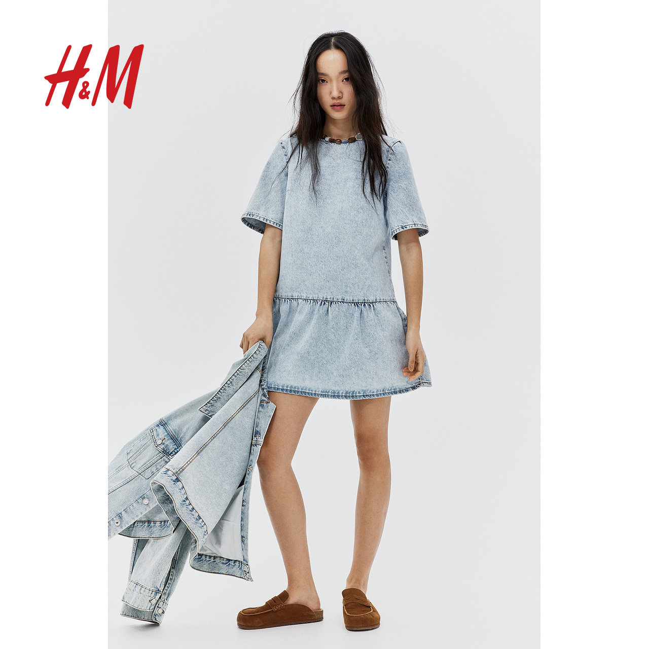 HM女装连衣裙2025冬季新款宽松圆领短袖后背系带牛仔裙1274344