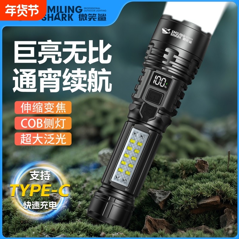 强光手电筒充电微笑鲨2025新款超级长续航耐用便携家用氙气照明灯