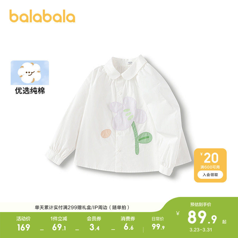 巴拉巴拉童装儿童衬衫女童春装装纯棉长袖衬衣贴布花朵文艺可爱潮