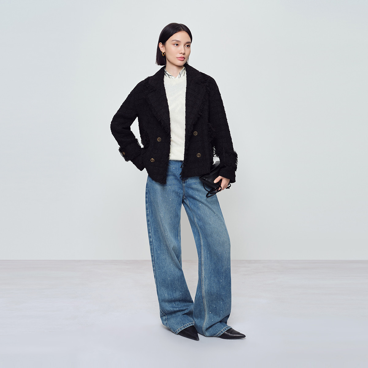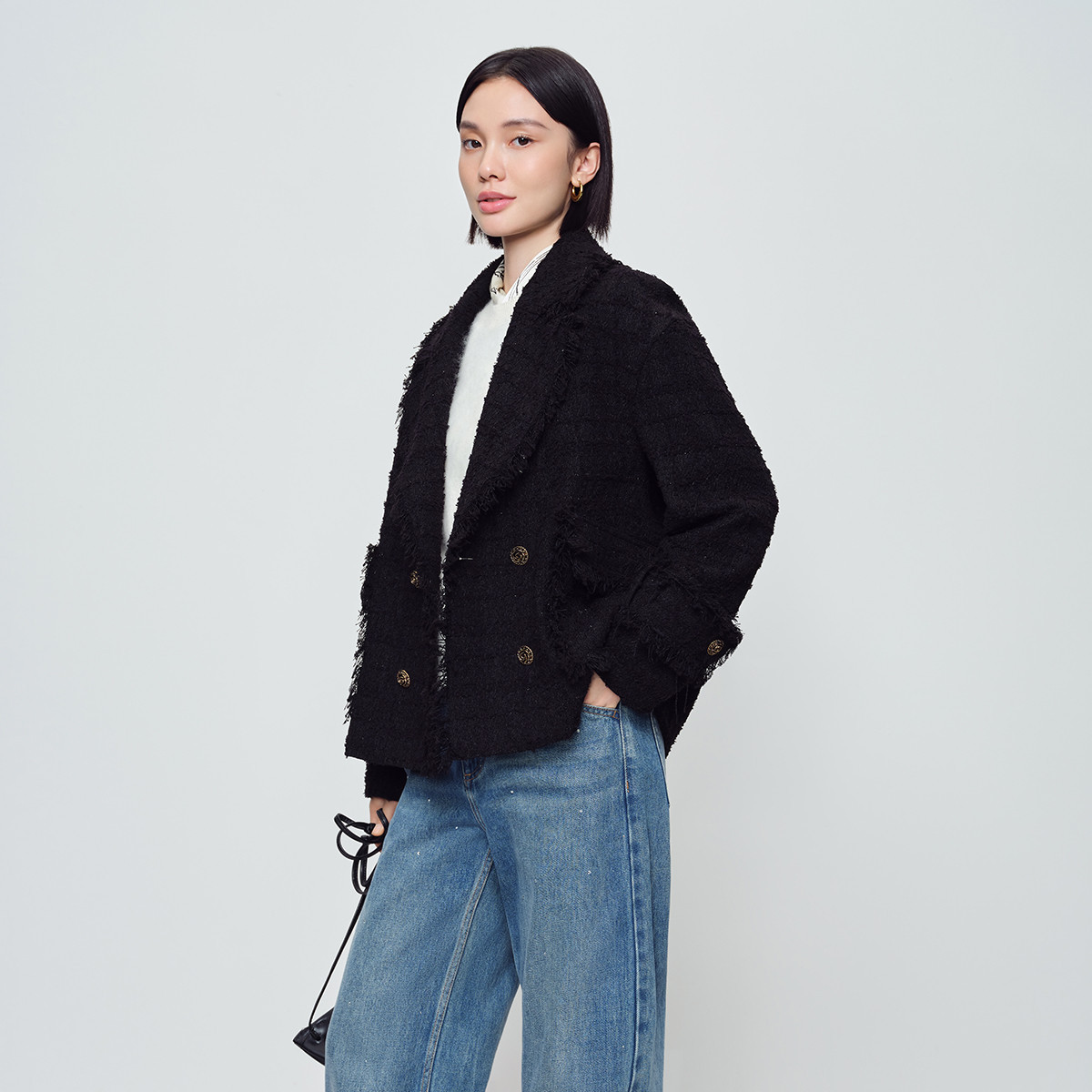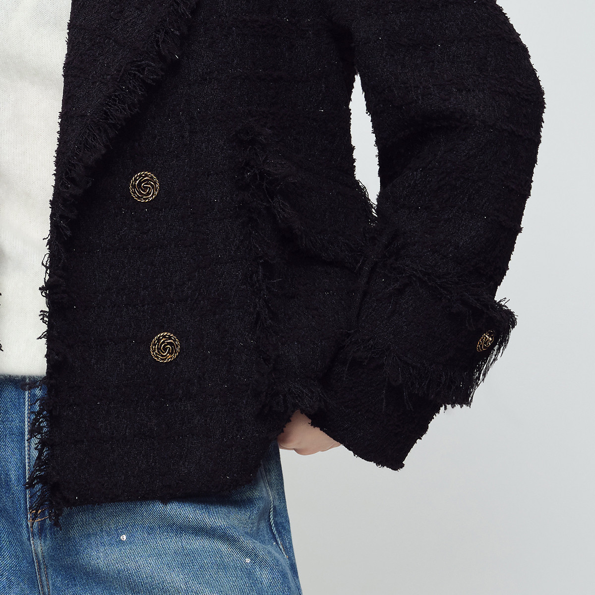 naivee春新款小香风西装领毛边外套经典粗花呢双排扣