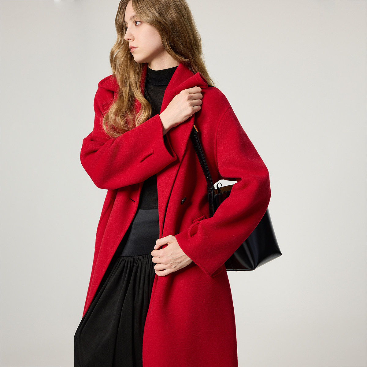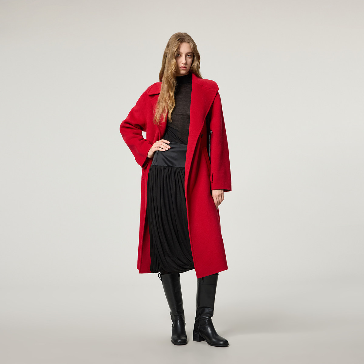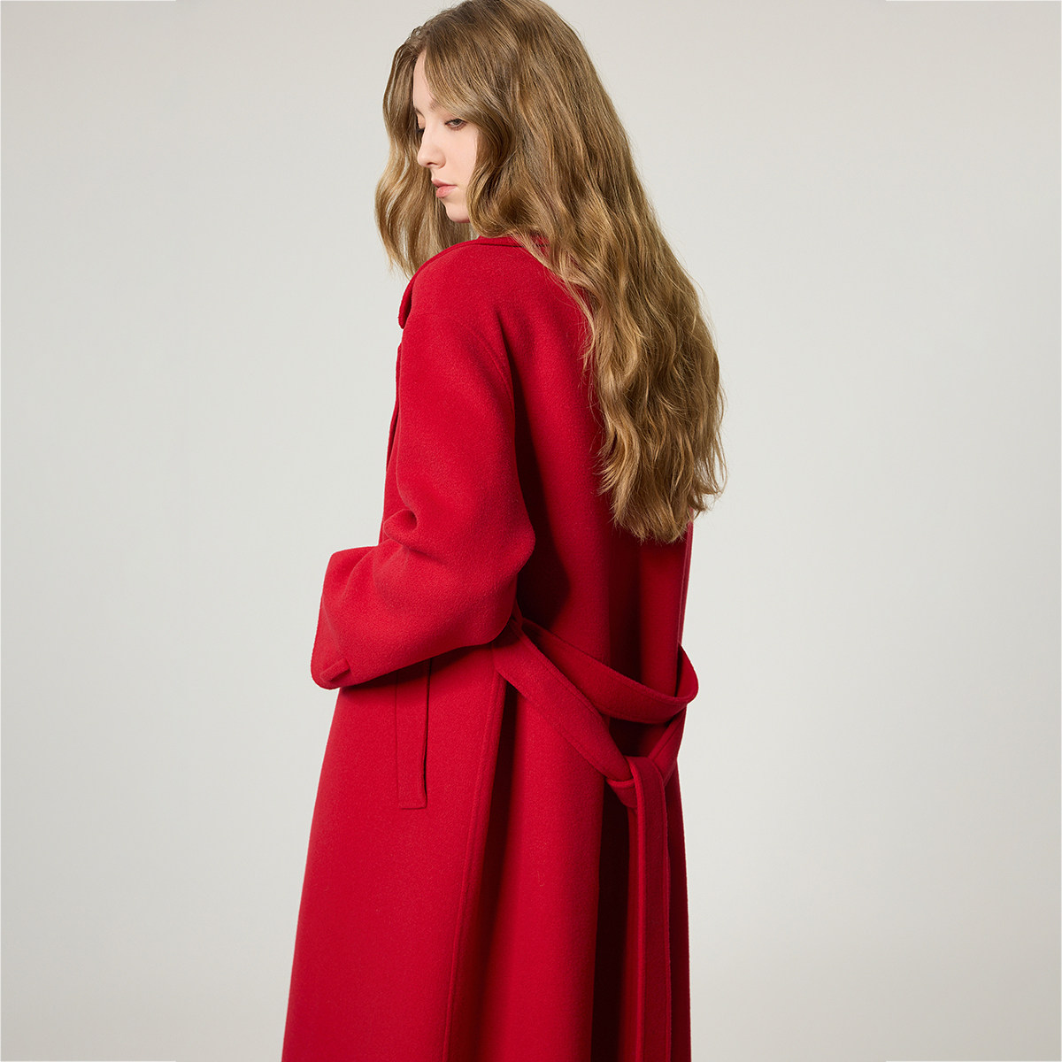OCHIRLY欧时力 纯羊毛双面呢大衣外套配腰带红色战袍2026春