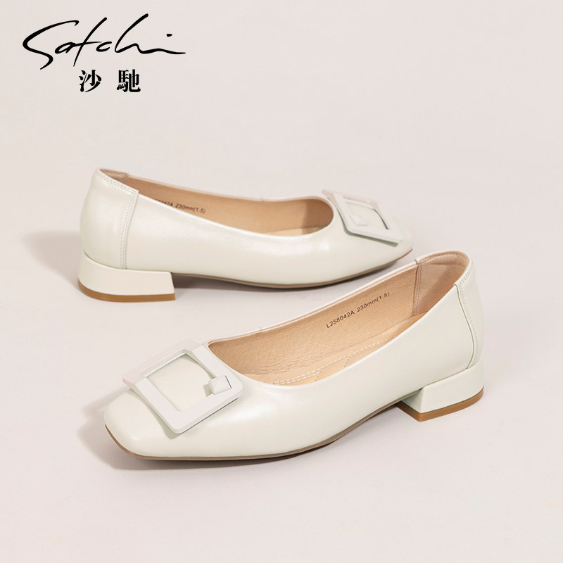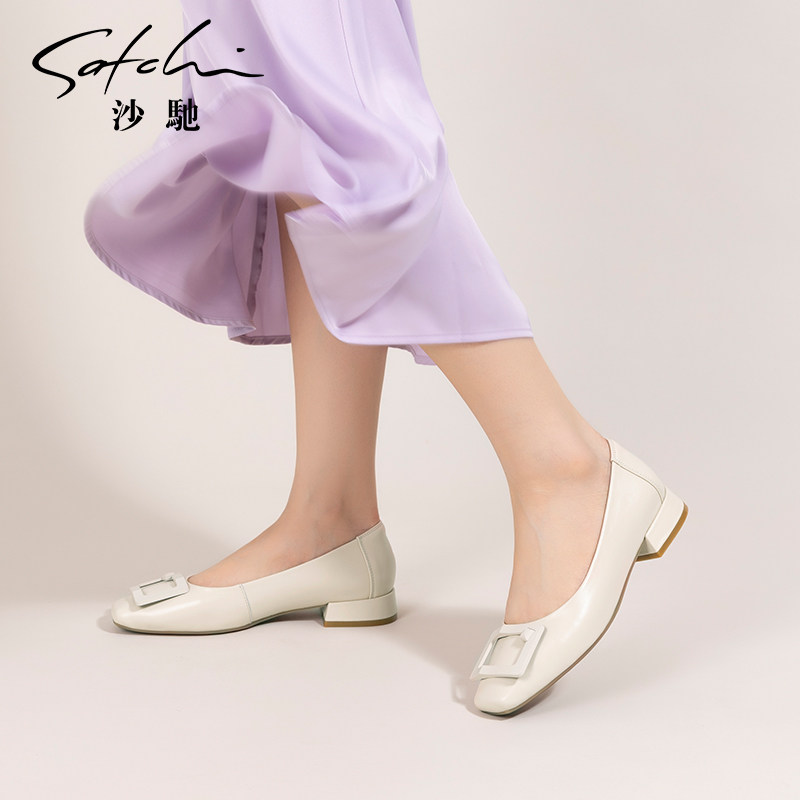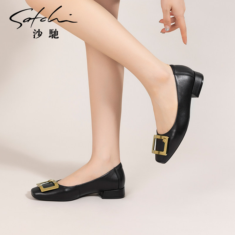 沙驰女鞋时尚经典方扣职业单鞋女春秋季新款舒适低粗跟通勤鞋真皮
