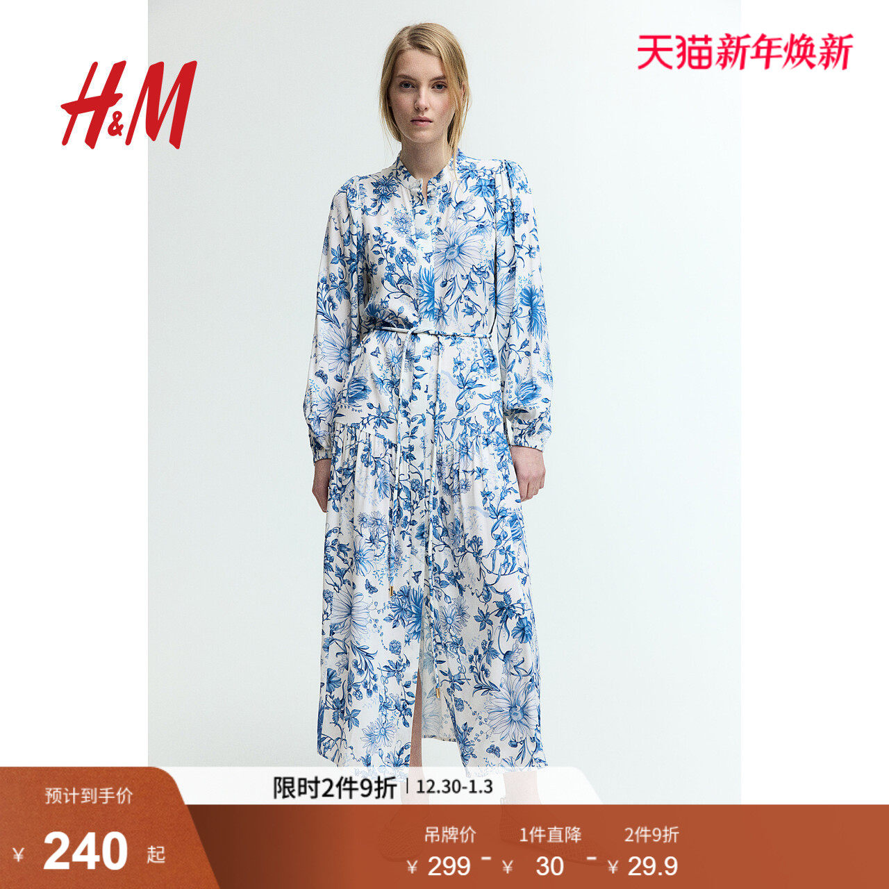 HM女装连衣裙冬季中式领泡泡袖收腰青花瓷印花长裙1272213