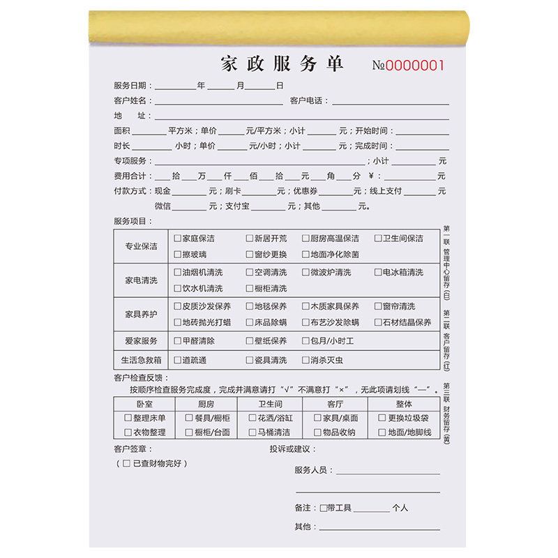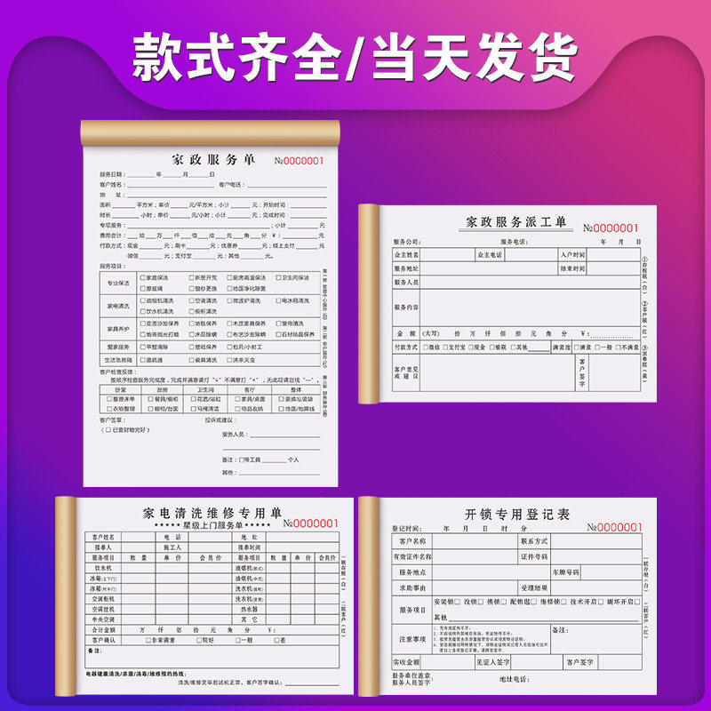 家政合同上门保洁验收单据家电清洗收据保姆钟点工清洁专用协议水电维修收费清单表开锁登记本家政服务派工单