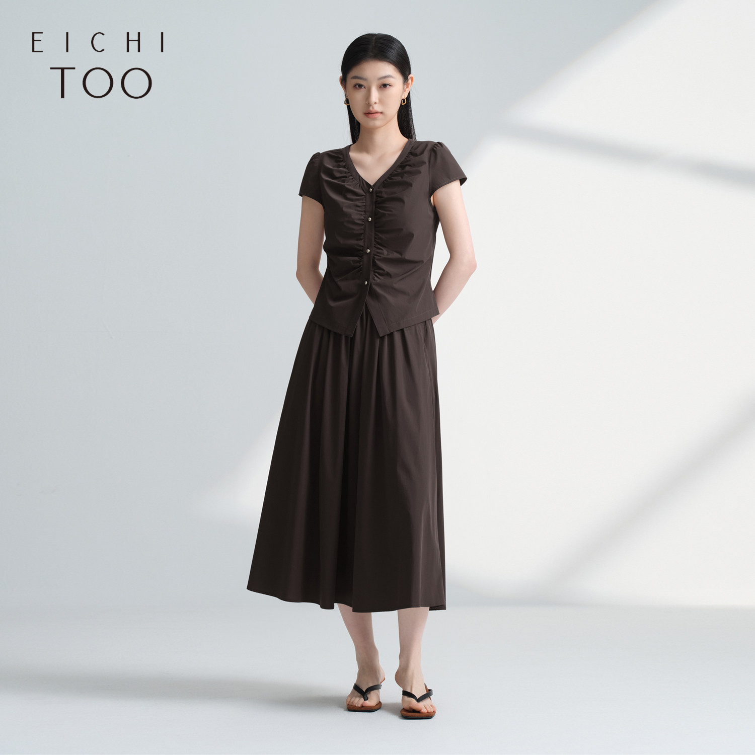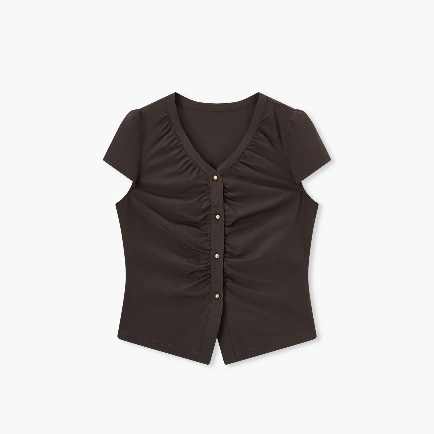 爱居兔V领褶皱微弹衬衫女2025年夏季新款轻薄收腰显瘦短袖衬衣