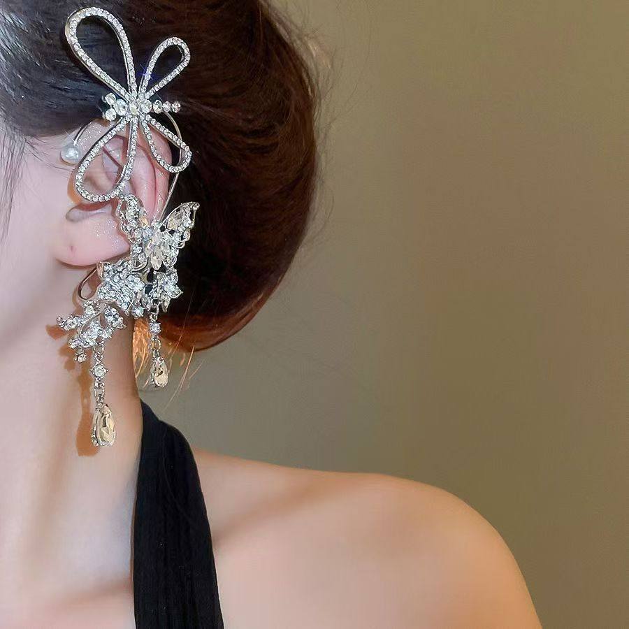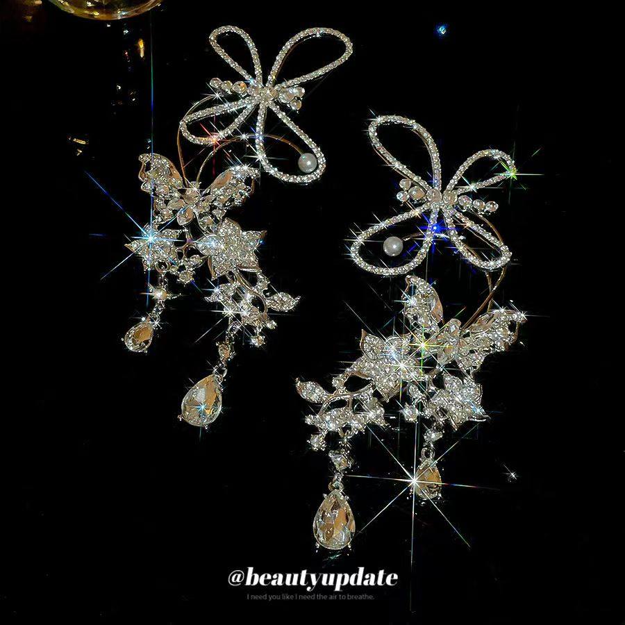 超闪镶钻蝴蝶花朵精灵耳挂时尚高级感显瘦新娘耳饰婚纱礼服裙配饰