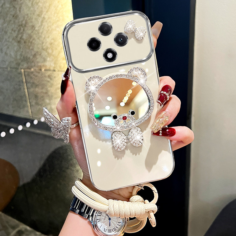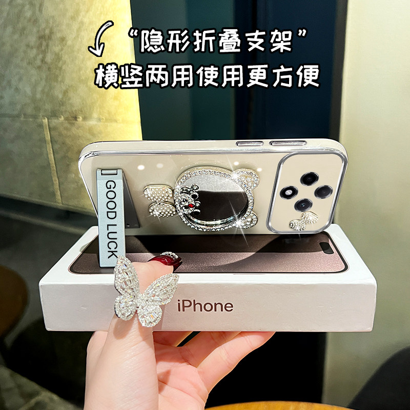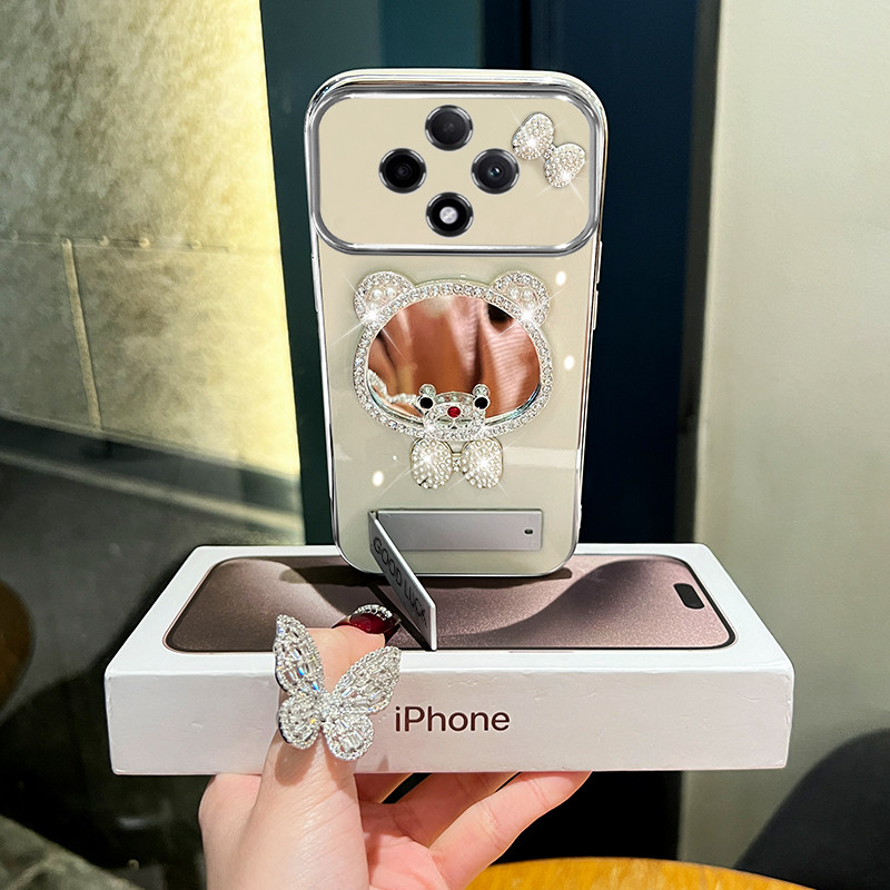 适用vivoy300手机壳y300pro领结熊补妆镜大视窗外壳创意全包电镀防摔壳