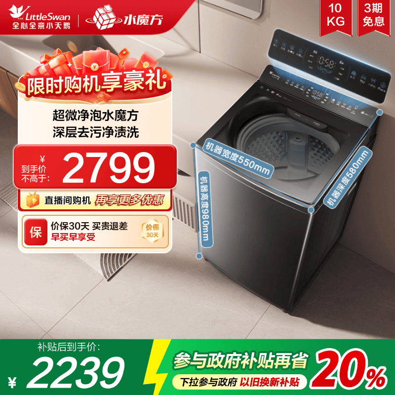 小天鹅小乌梅2.0水魔方波轮10KG全自动大容量家用变频洗衣机 E40D