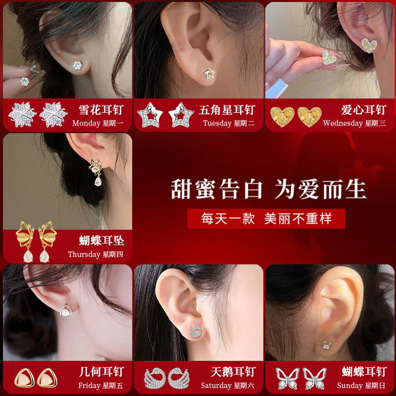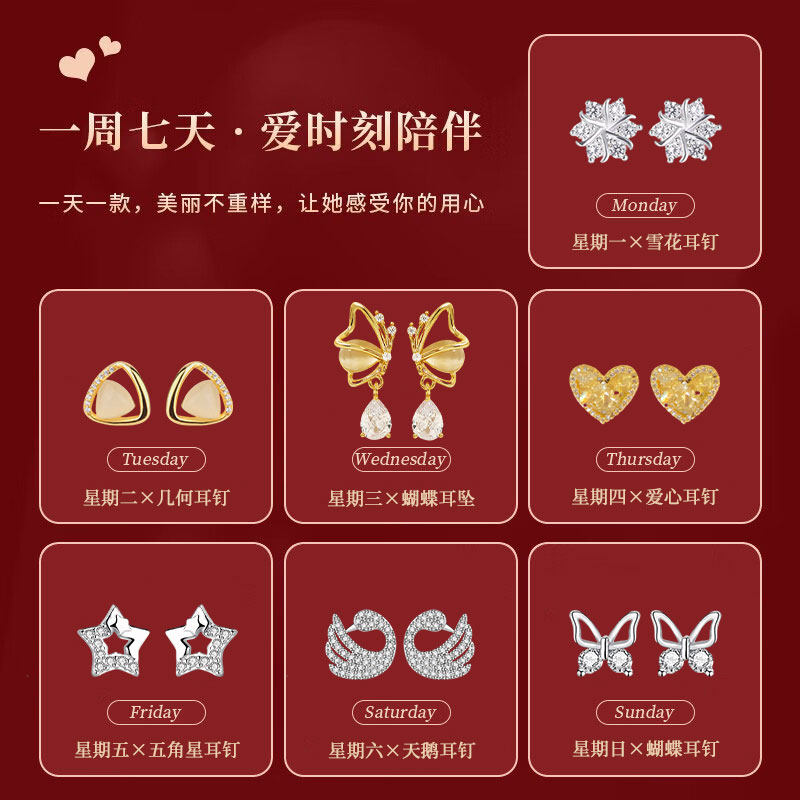 一周星期耳钉女生礼盒套装银耳环新年生日礼物送老婆流苏新款七天