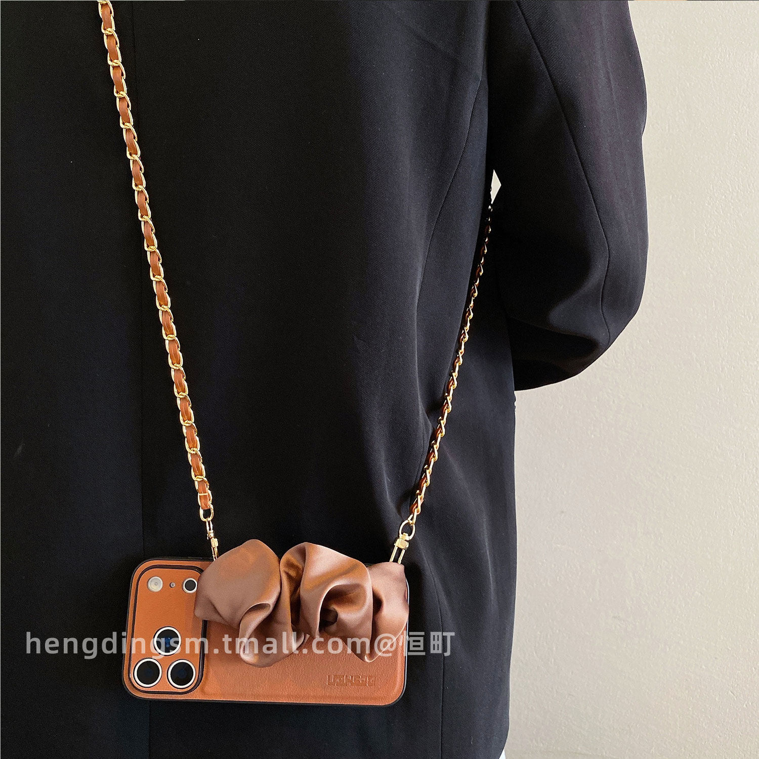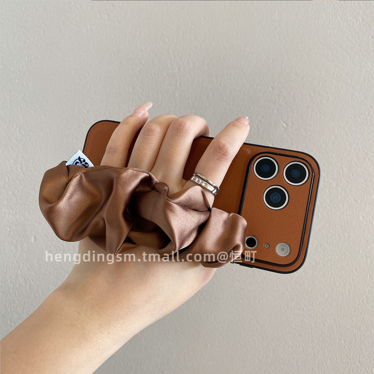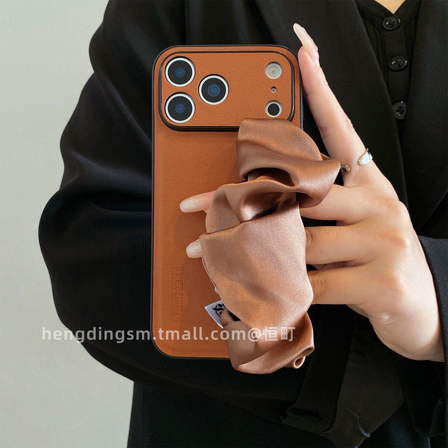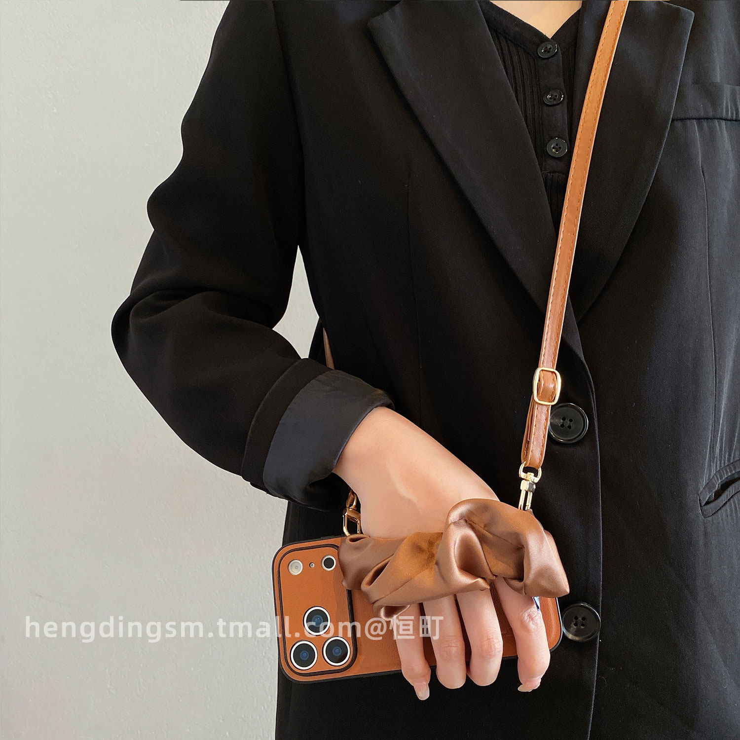 高级复古棕皮纹弹力丝巾腕带适用苹果17promax手机壳16pro手腕带15pro金属背带14斜挎皮绳iPhone13女12防摔11