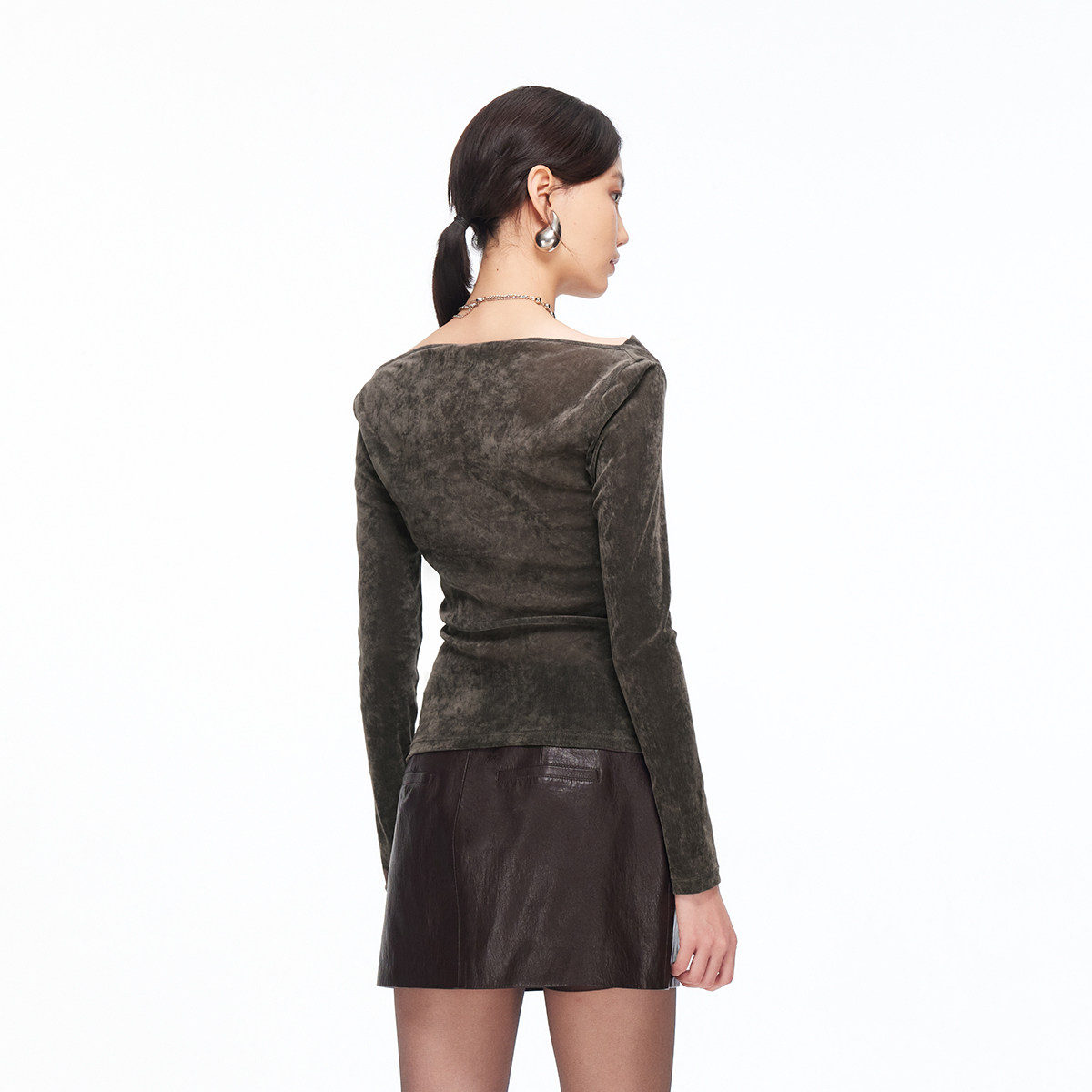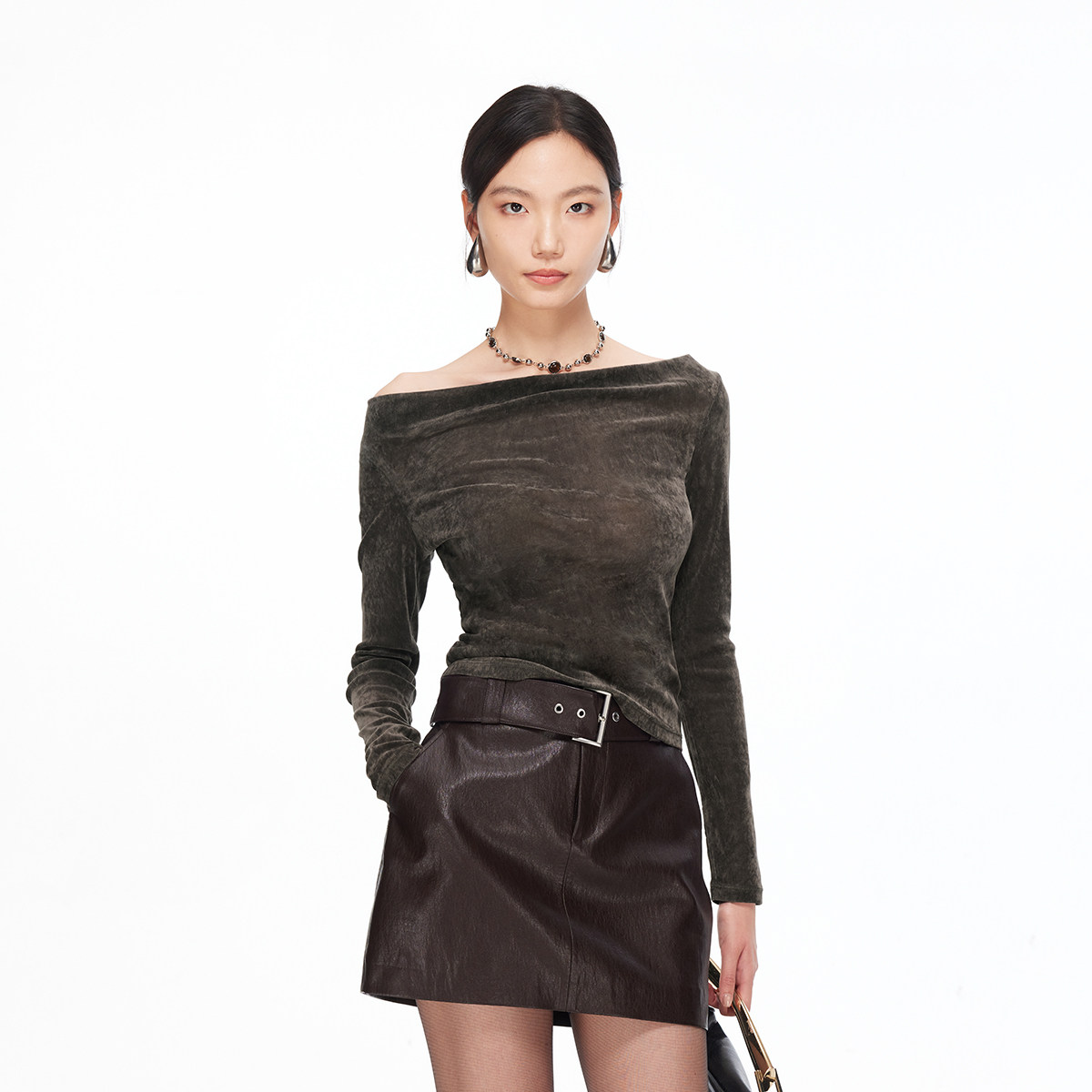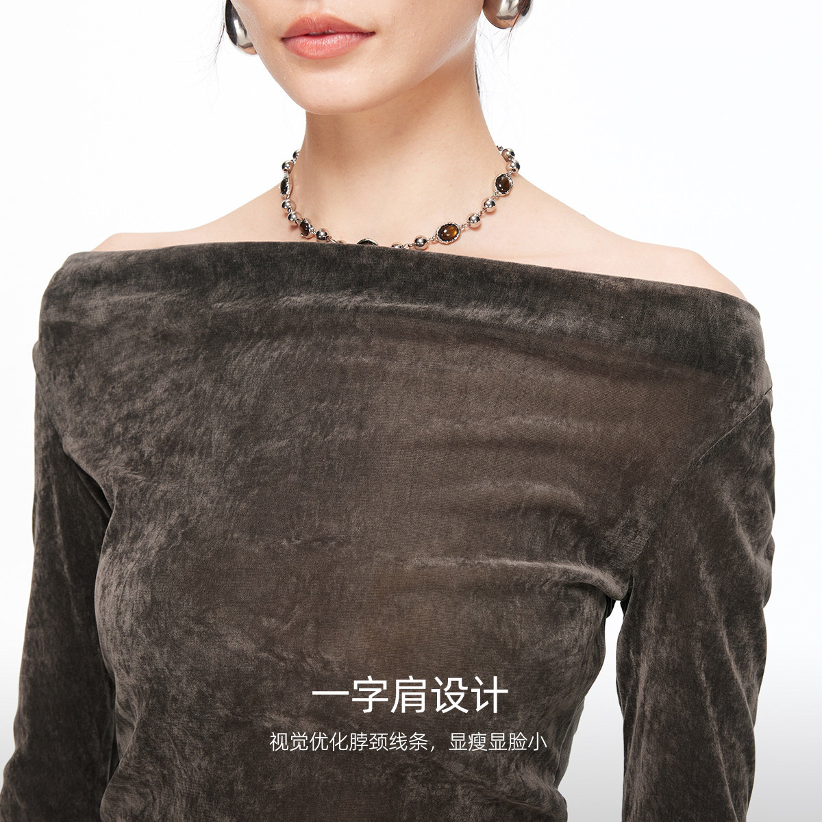 修身版型,勾勒身形;一字肩,优化脖颈线条
