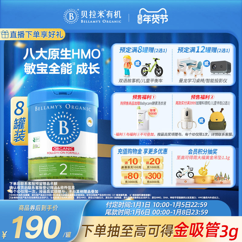 【官方正品】贝拉米经典HMO有机幼儿配方DHA牛奶粉2段800g*8罐装