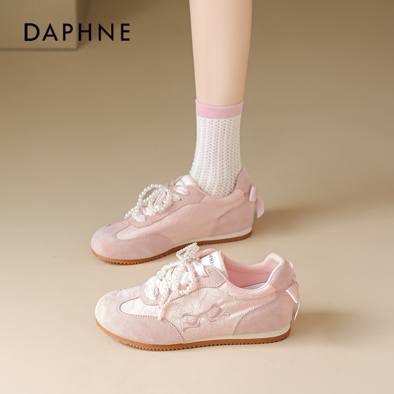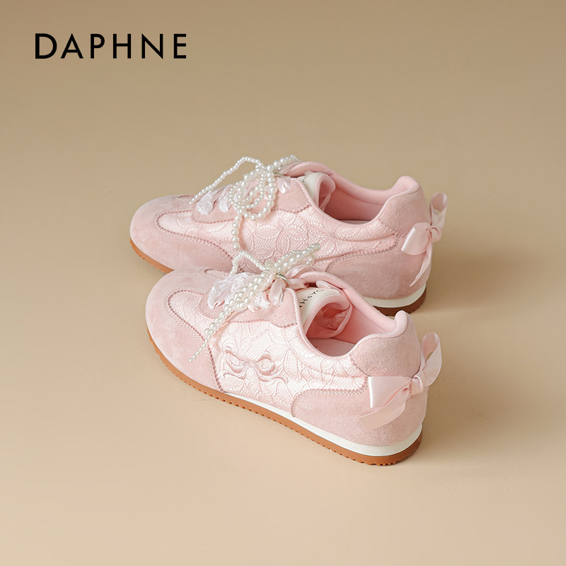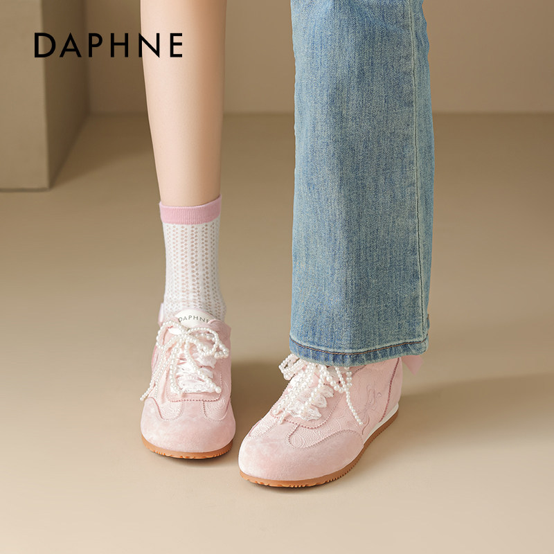 达芙妮粉色芭蕾德训鞋内增高女夏2025新款国风刺绣小白鞋休闲板鞋