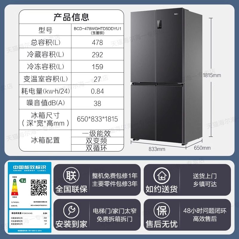 政府补贴海尔电冰箱478L一级能效家用十字四门风冷无霜官方旗舰店