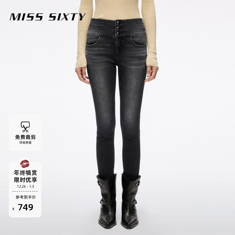 Miss Sixty2025秋季新款牛仔裤女三环高腰复古黑灰紧身裤铅笔裤