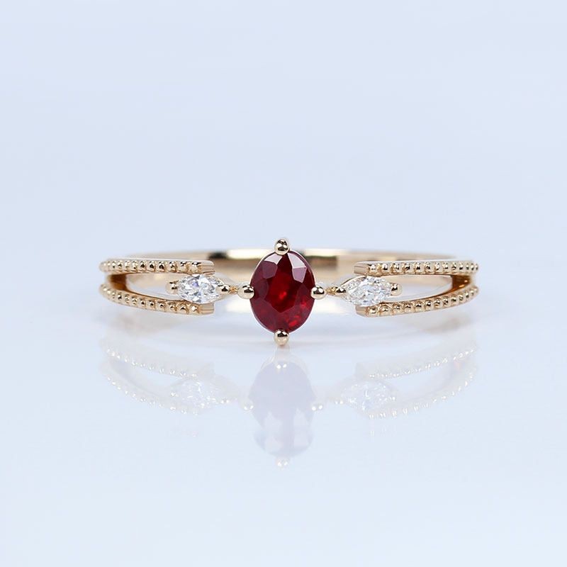 18K玫瑰金天然鸽血红宝石分叉戒指 彩金马眼钻石复古指环手饰女款
