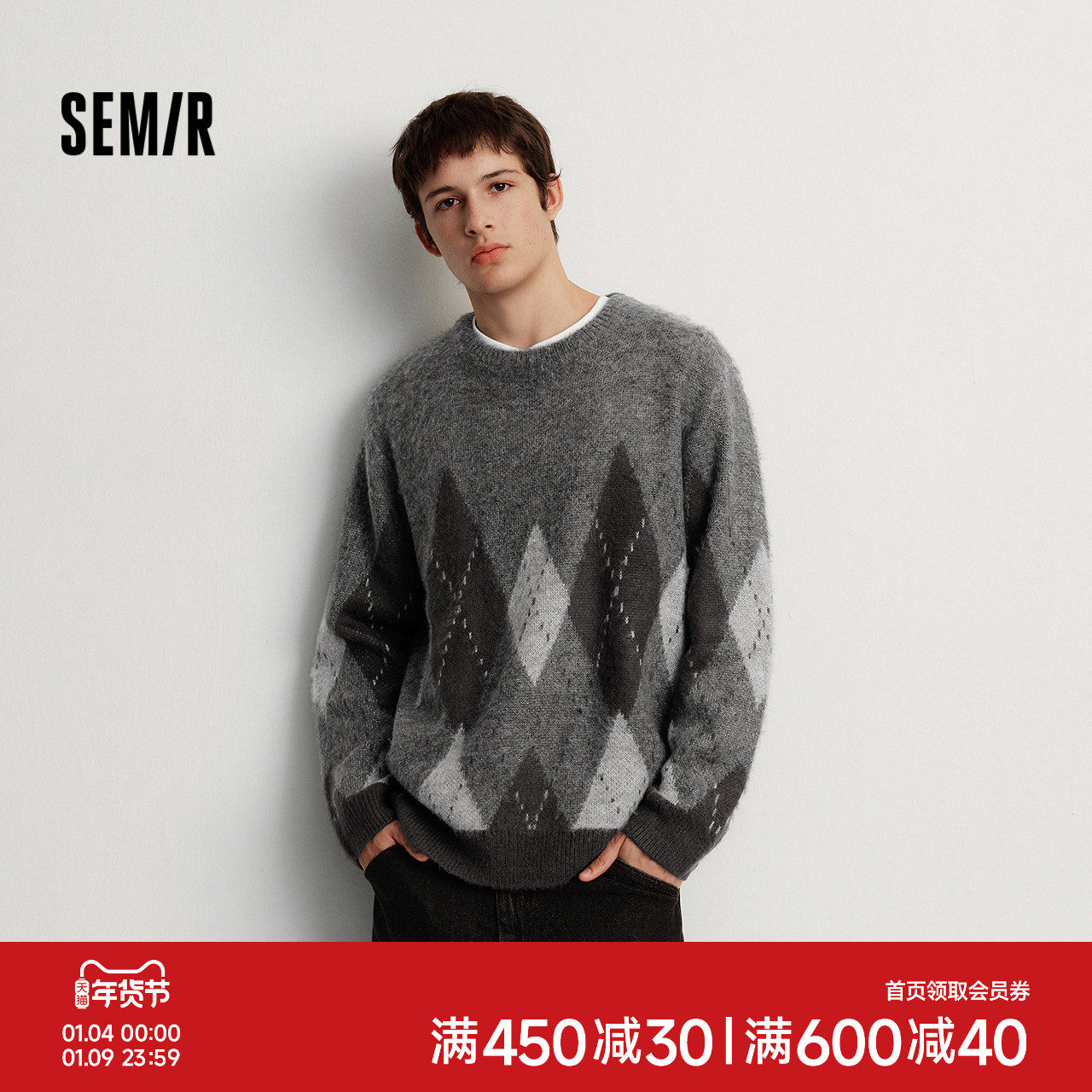 森马毛衫男冬季仿马海毛格纹提花针织衫2025新款复古学院风情侣装