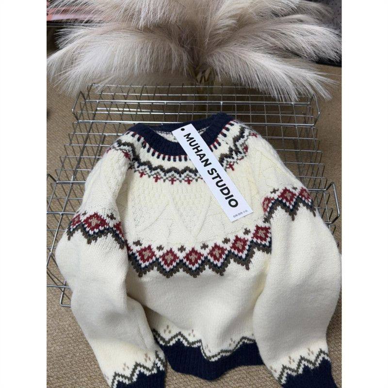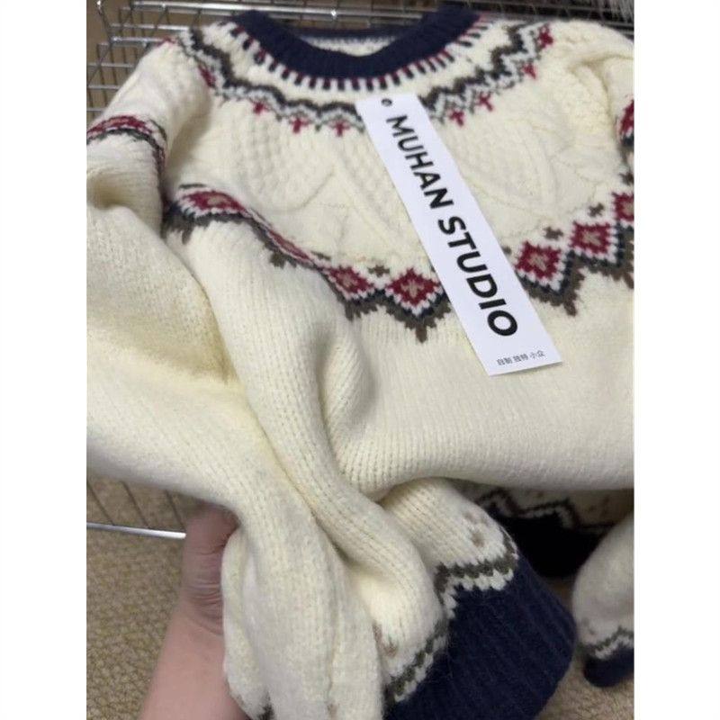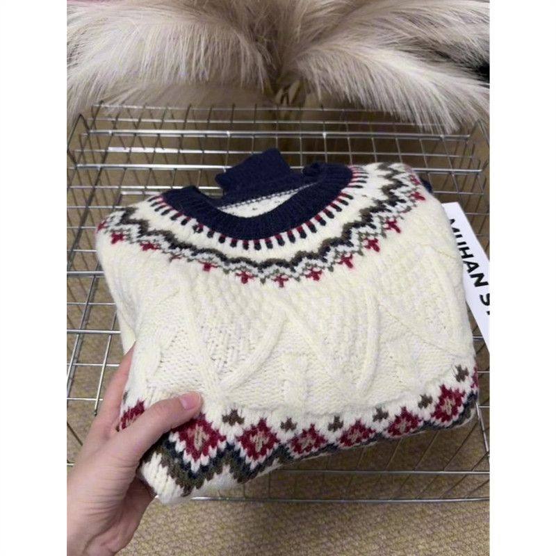 慵懒白色费尔岛毛衣女秋冬加厚宽松高级感可外穿大码内搭针织上衣