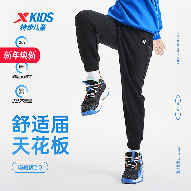 特步童装儿童运动裤男童2025秋季新款针织卫裤男孩黑色长裤子加绒