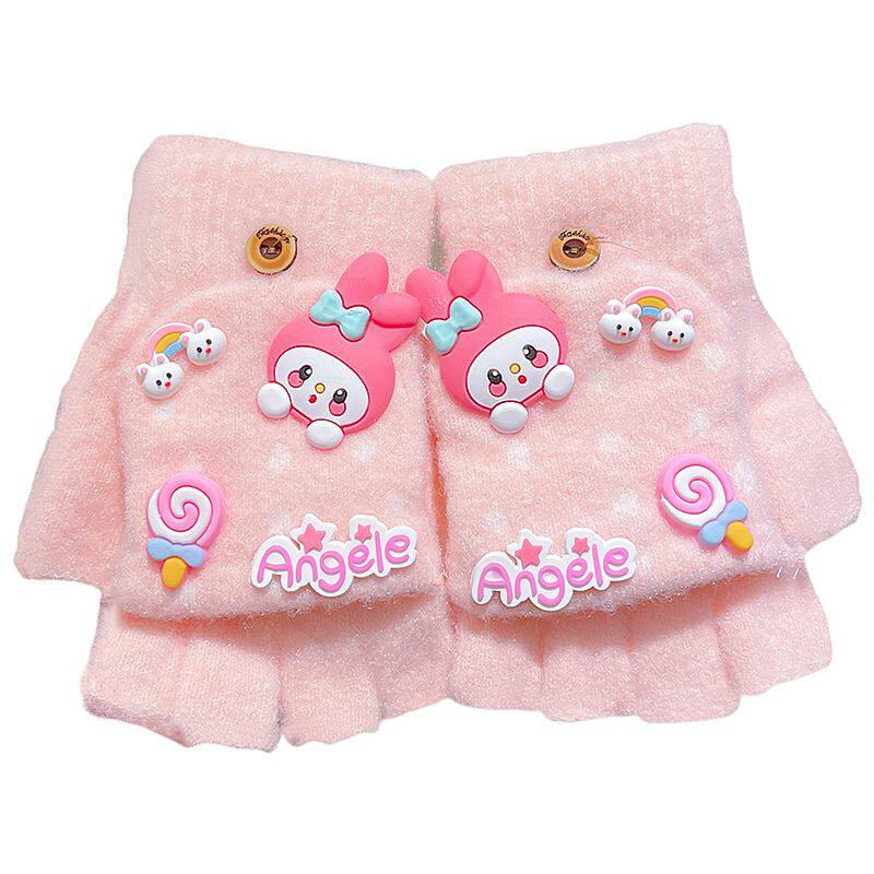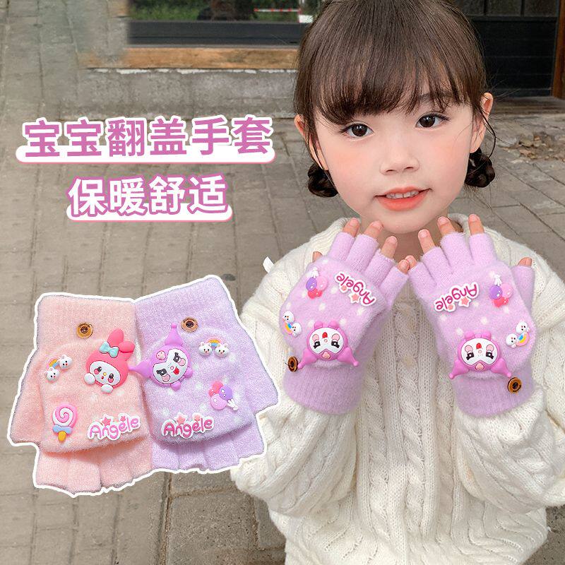 儿童半指翻盖手套库洛米卡通露指五指套男女童秋冬保暖半指套粉色