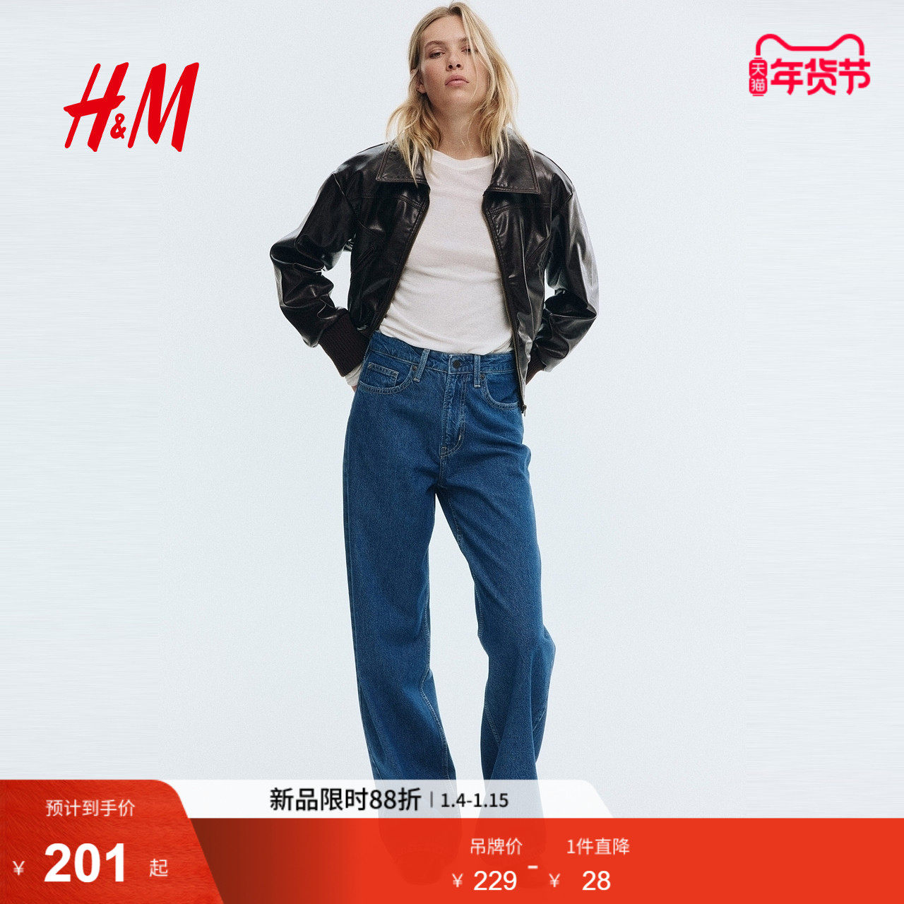 HM女装牛仔裤冬季直筒复古牛仔裤加高腰时尚潮流长裤1222670
