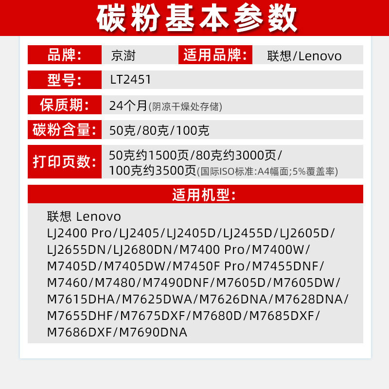 京澍适用兄弟M7460碳粉LENOVO M7480多功能黑白激光打印机墨粉M7490DNF炭粉LD2451硒鼓粉LT2451专用黑色碳粉