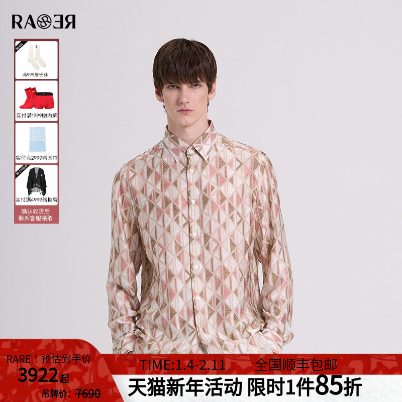 RARE威雅男装 秋冬新款几何提花粉色真丝长袖衬衫男