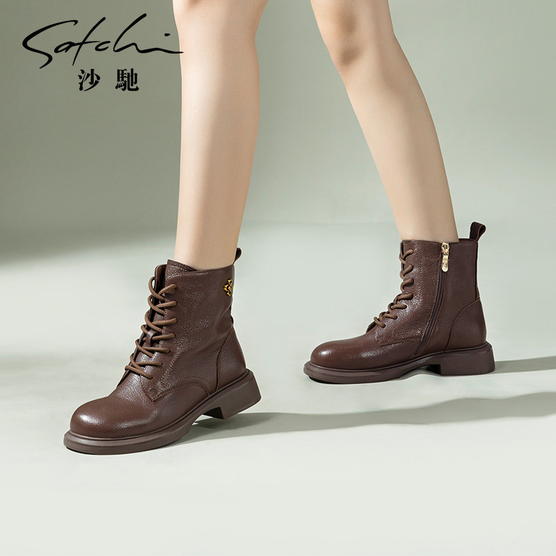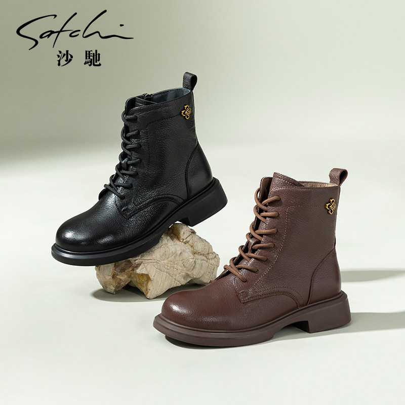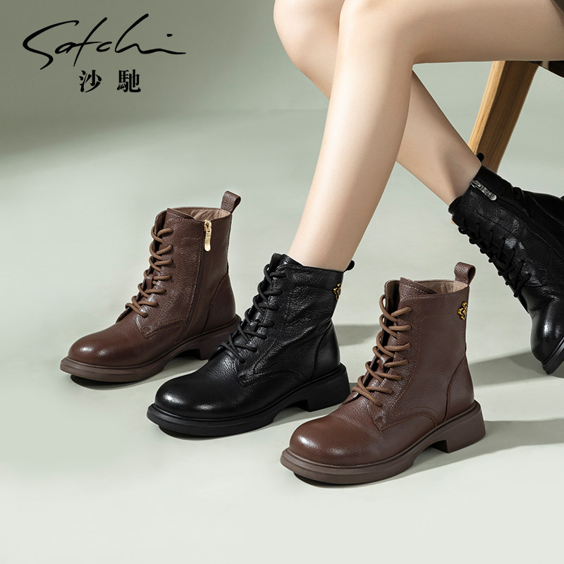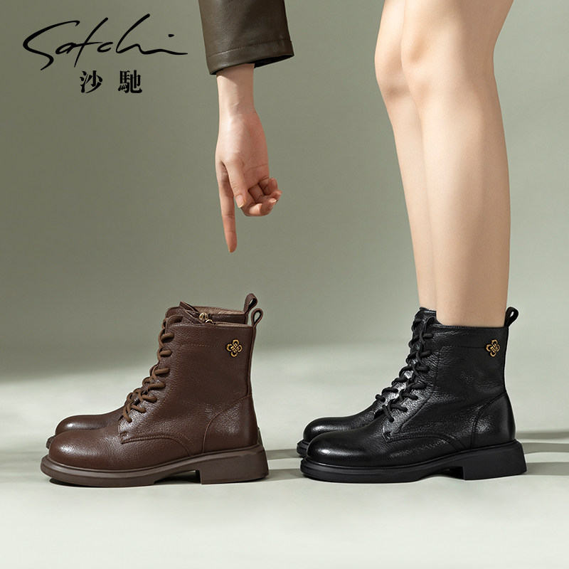 沙驰女鞋冬季加绒保暖马丁靴女靴2025新款圆头拉链短筒休闲短靴子