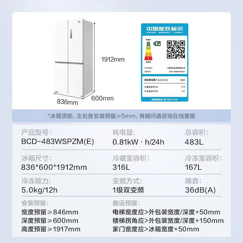 Midea/美的 BCD-483WSPZM(E)风冷无霜M60零嵌超薄十字四开门冰箱