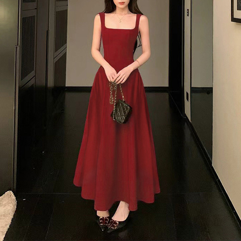 红色吊带连衣裙女法式气质订婚礼服收腰显瘦气质赫本风红裙子长裙