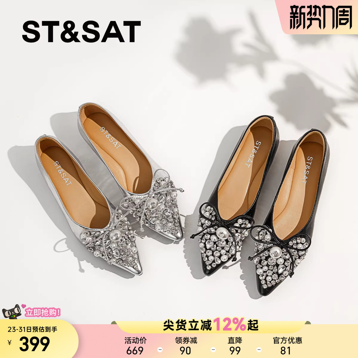 星期六尖头浅口单鞋女2025新款平底法式水钻仙女风蝴蝶结个性女鞋