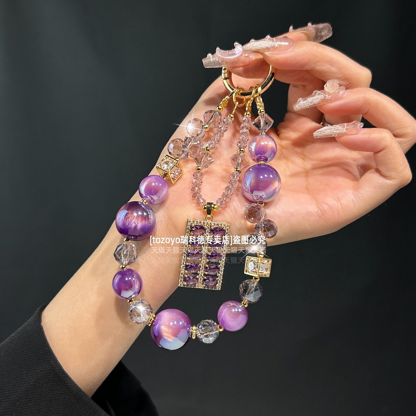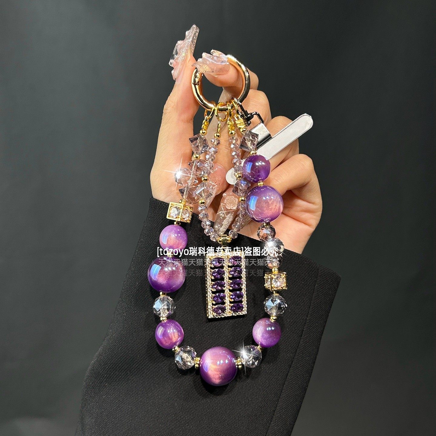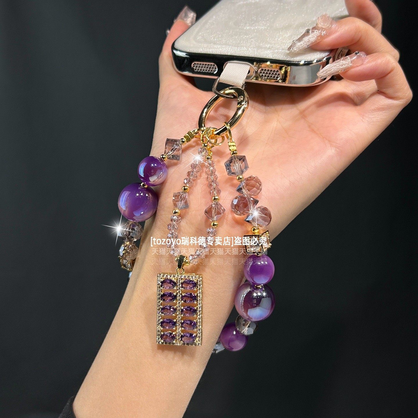 漂亮紫色手机链精致锆石算盘吊坠渐变紫水晶挂链轻奢高级感挂手腕链条高贵名媛气质手链短腕带包包挂饰垫片壳