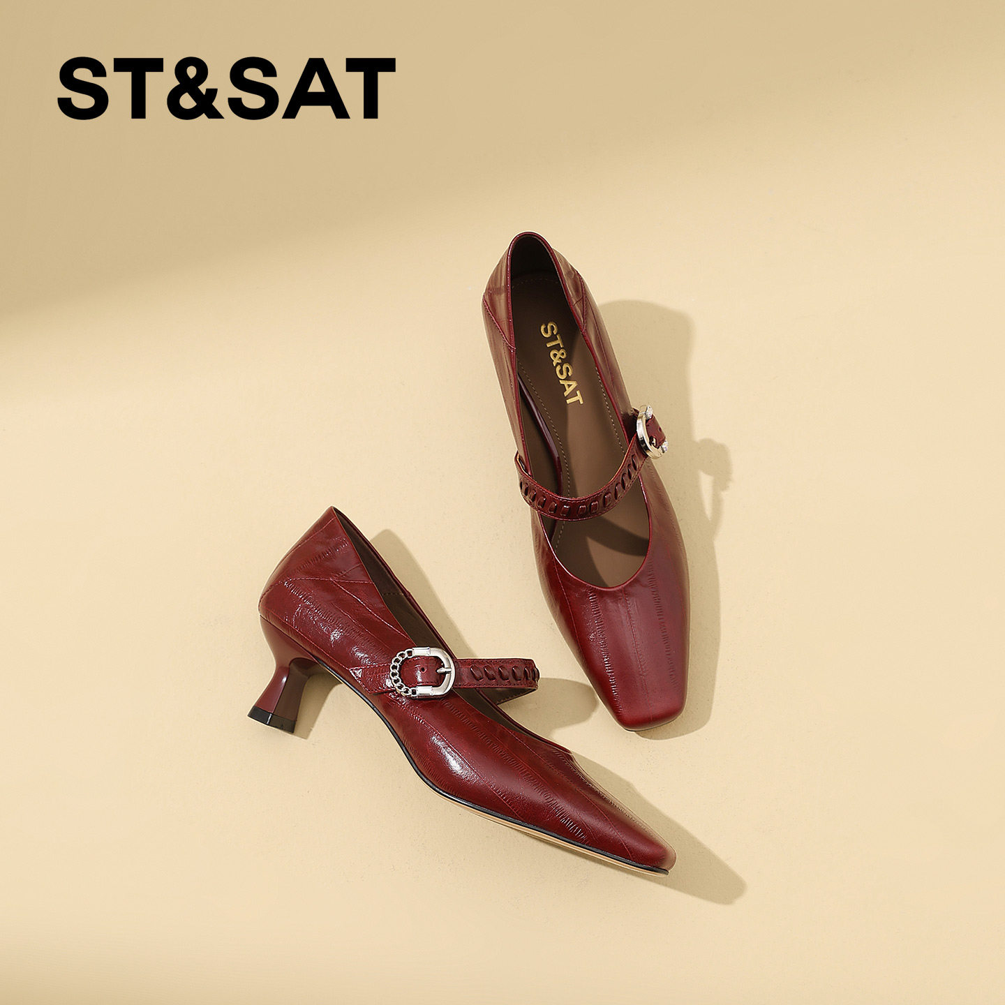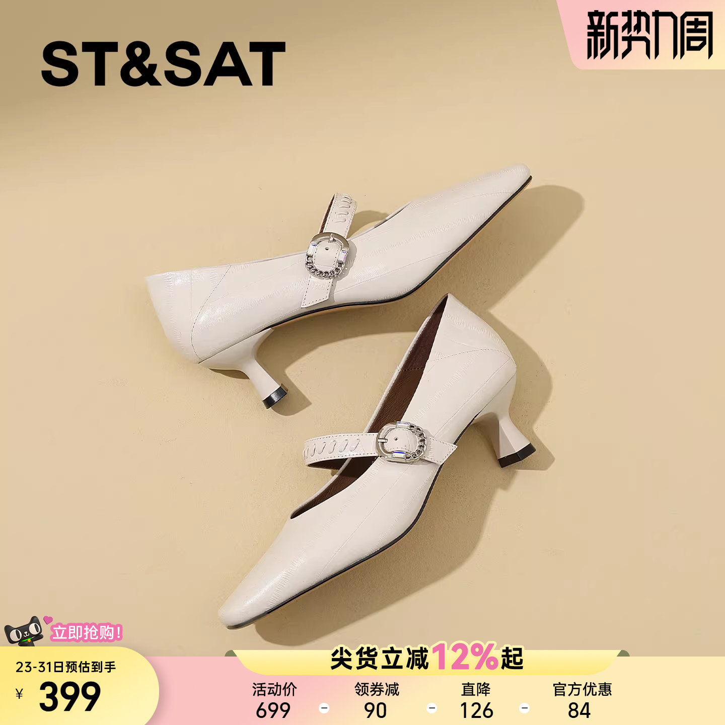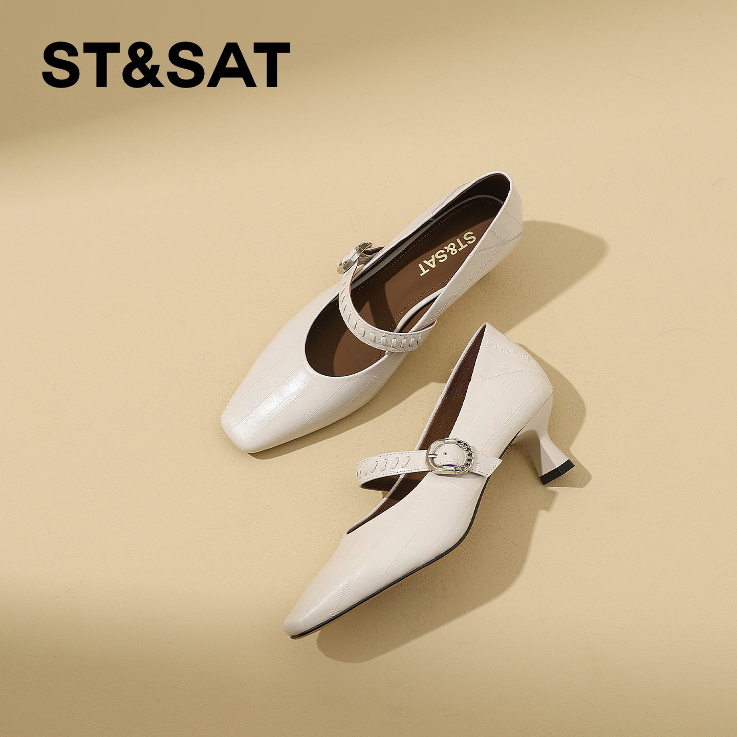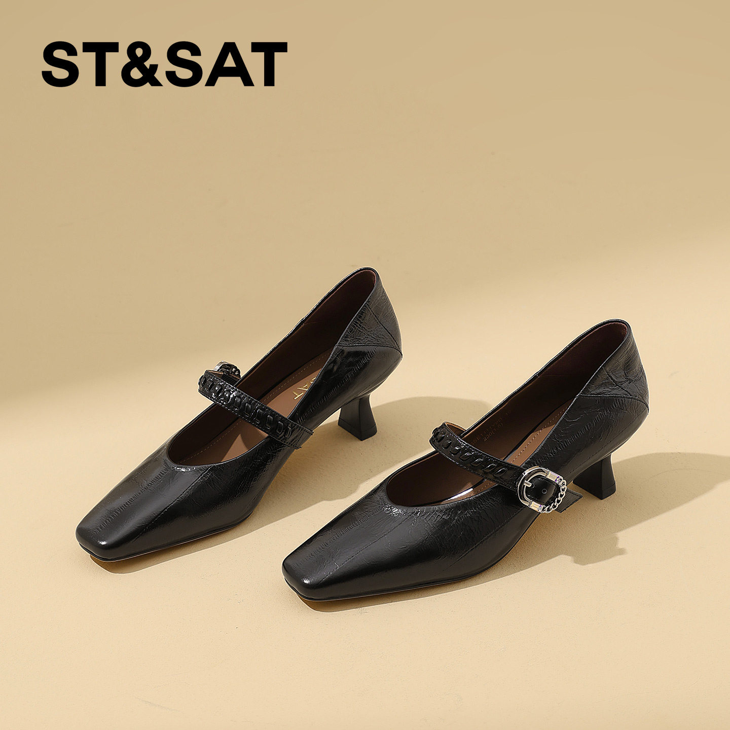星期六真皮通勤方头浅口高跟鞋女2026春季新款猫跟不累脚浅口单鞋
