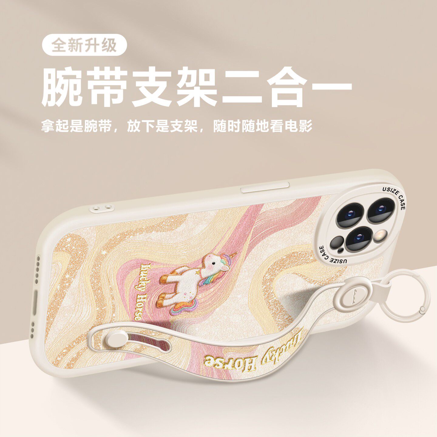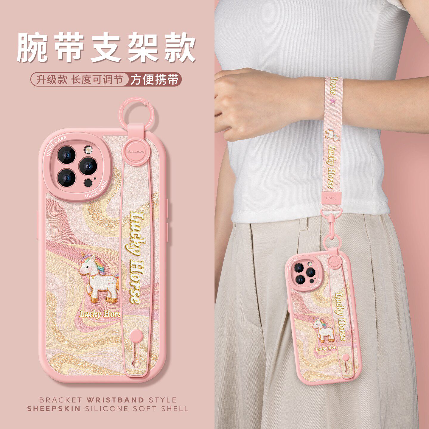 丝绸小马适用苹果16Promax手机壳14pro新款女iPhone13全包17防摔iPhone15腕带挂绳7plus斜跨6s斜挎挂脖xr背带