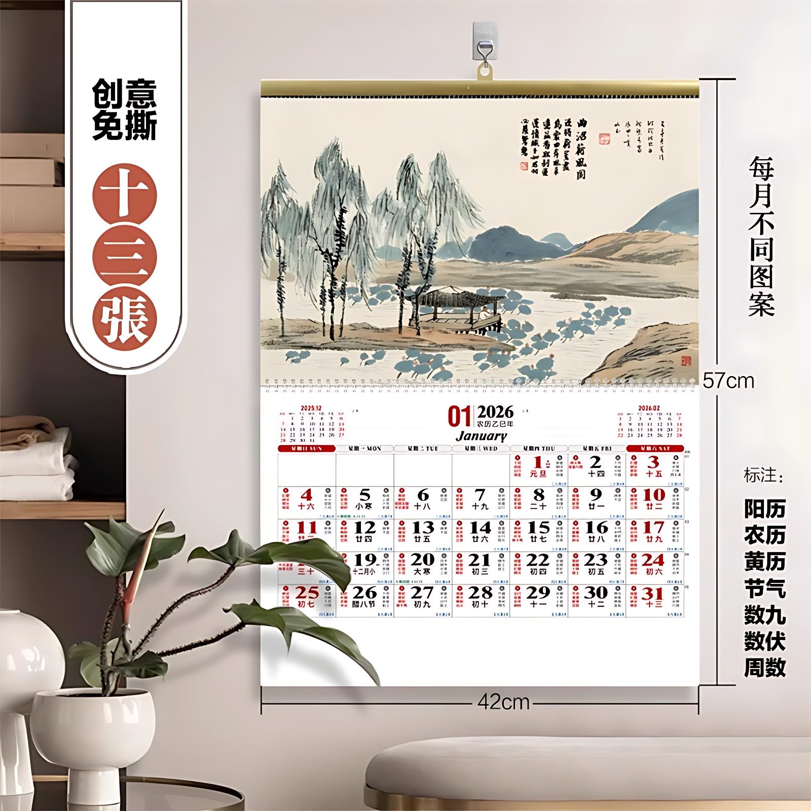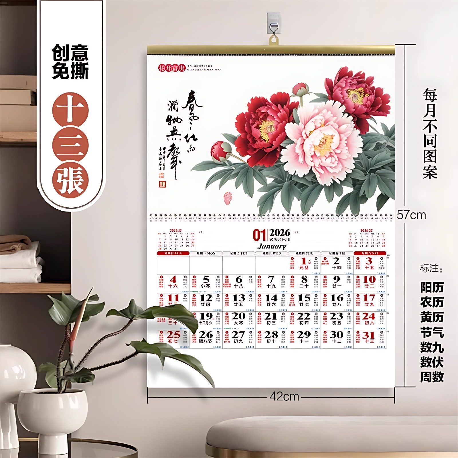 2026马年免撕挂历家用创意简约个性13张日历大号挂墙式工笔画花鸟山水风景牡丹月历公司企业广告定制定做logo