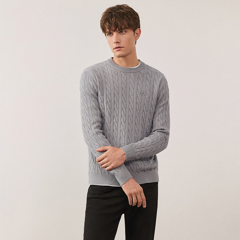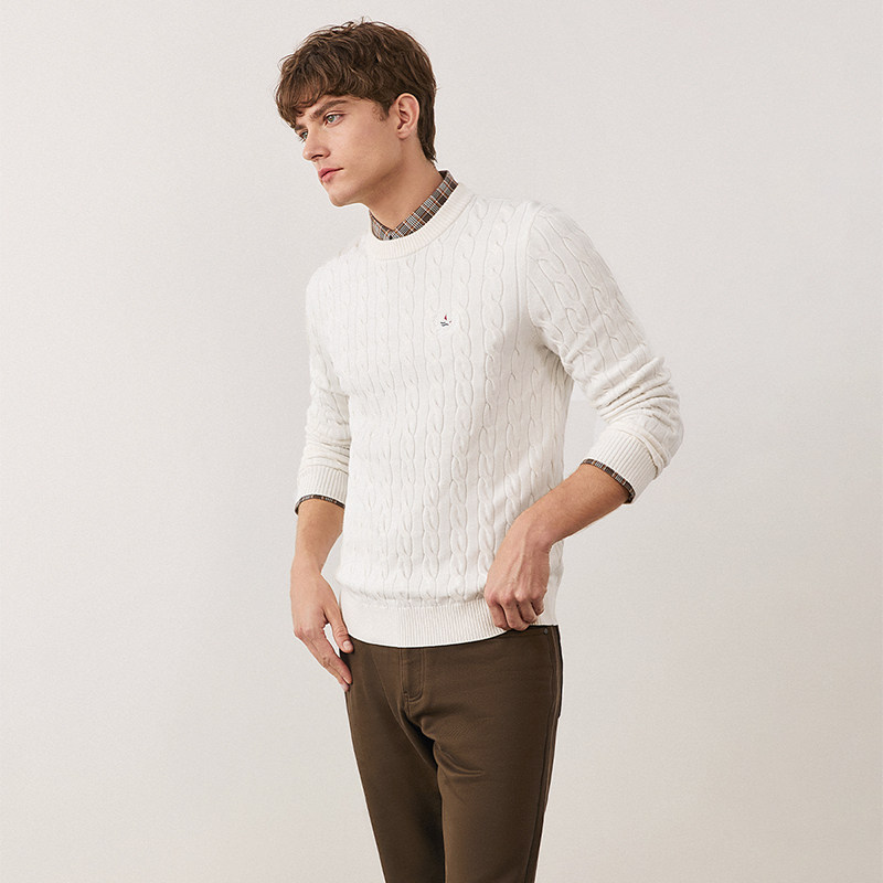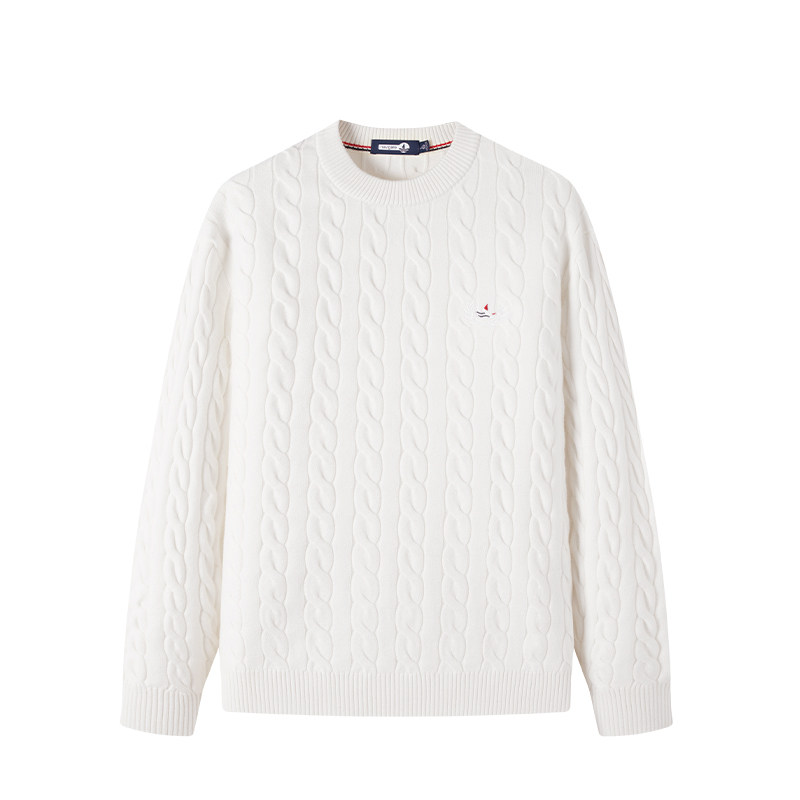 Navigare意大利小帆船白色绞花毛衣男士秋冬新款亲肤绒圆领针织衫